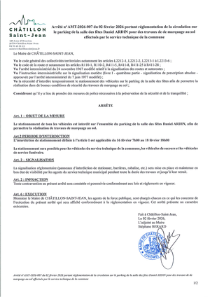 En raison de travaux de marquage au sol, le stationnement sera interdit sur le parking de la salle des fêtes Daniel Ardin du lundi 16 février à 07h00 au mercredi 18 février à 18h00.