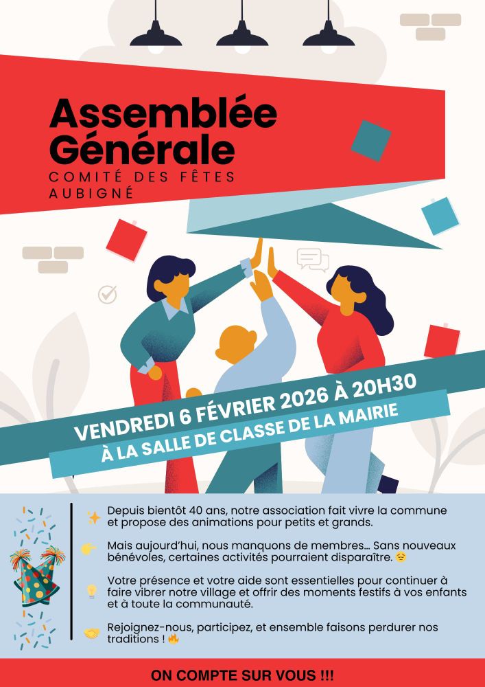 Une erreur s'est glissée sur l'agenda de l'écho d'Aubigné, le comité des fêtes d'Aubigné organise son assemblée générale à 20h30 le vendredi 6 février et non 19h30.