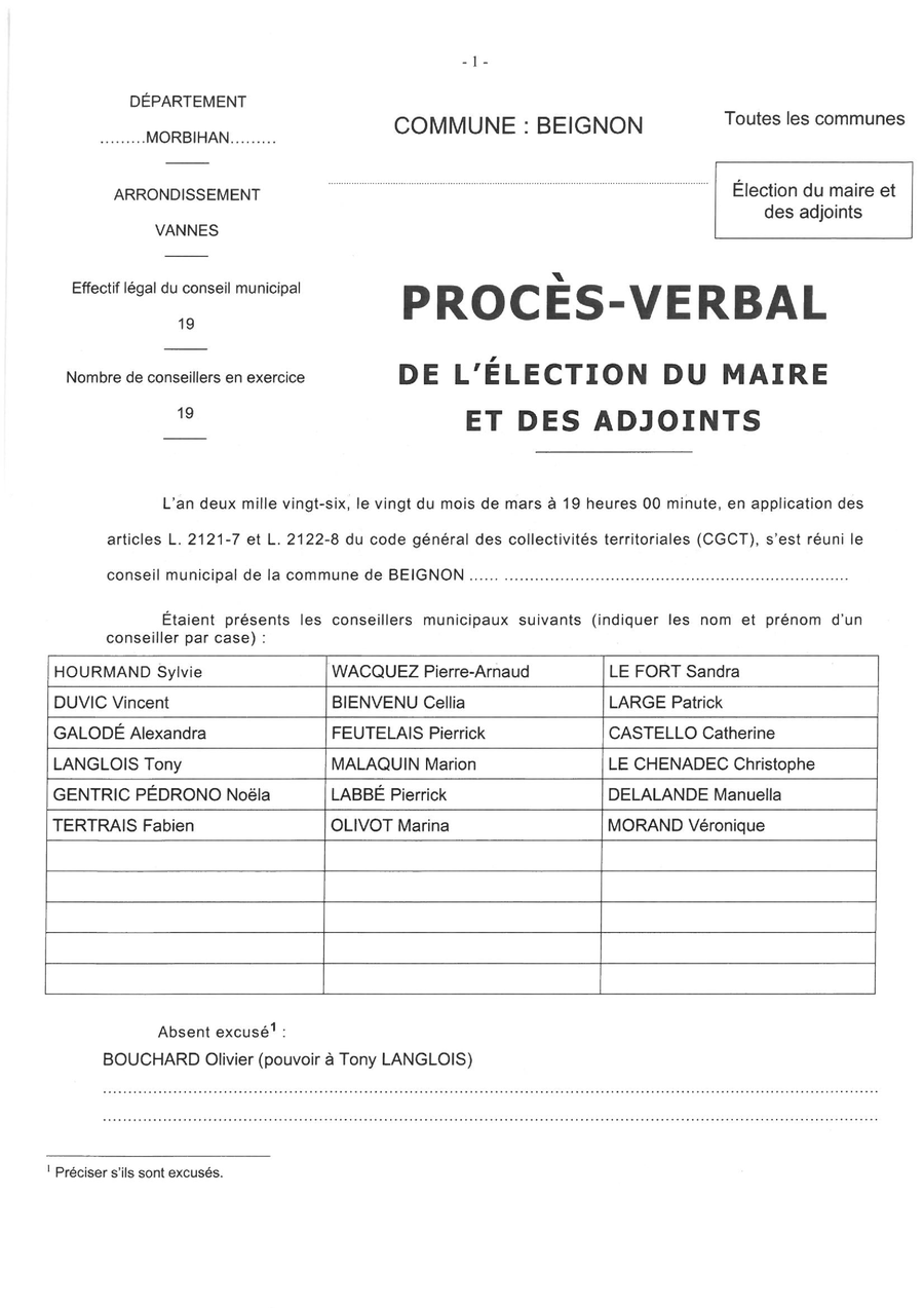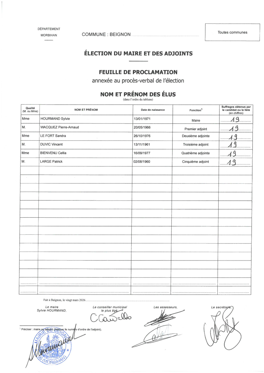Hier soir s'est tenue la séance d'installation du conseil municipal. Vous trouverez le PV ci-joint avec la feuille de proclamation des résultats.