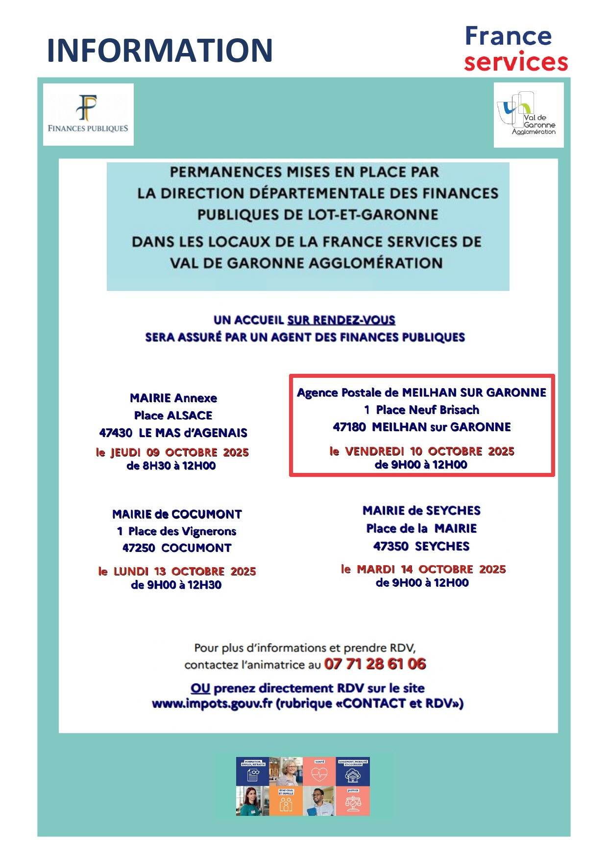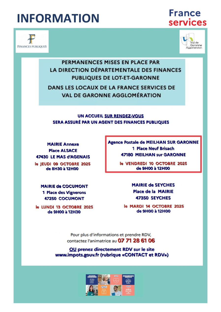 Une permanence mise en place par la direction départementale des finances publiques concernant la campagne des avis 2025 aura lieu dans votre agence postale communale de Meilhan-sur-Garonne le vendredi 10 octobre de 9h à 12h.