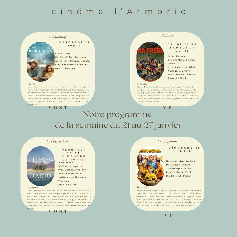 Ci-joint le programme de l’Armoric cinéma du 21 au 27 janvier.