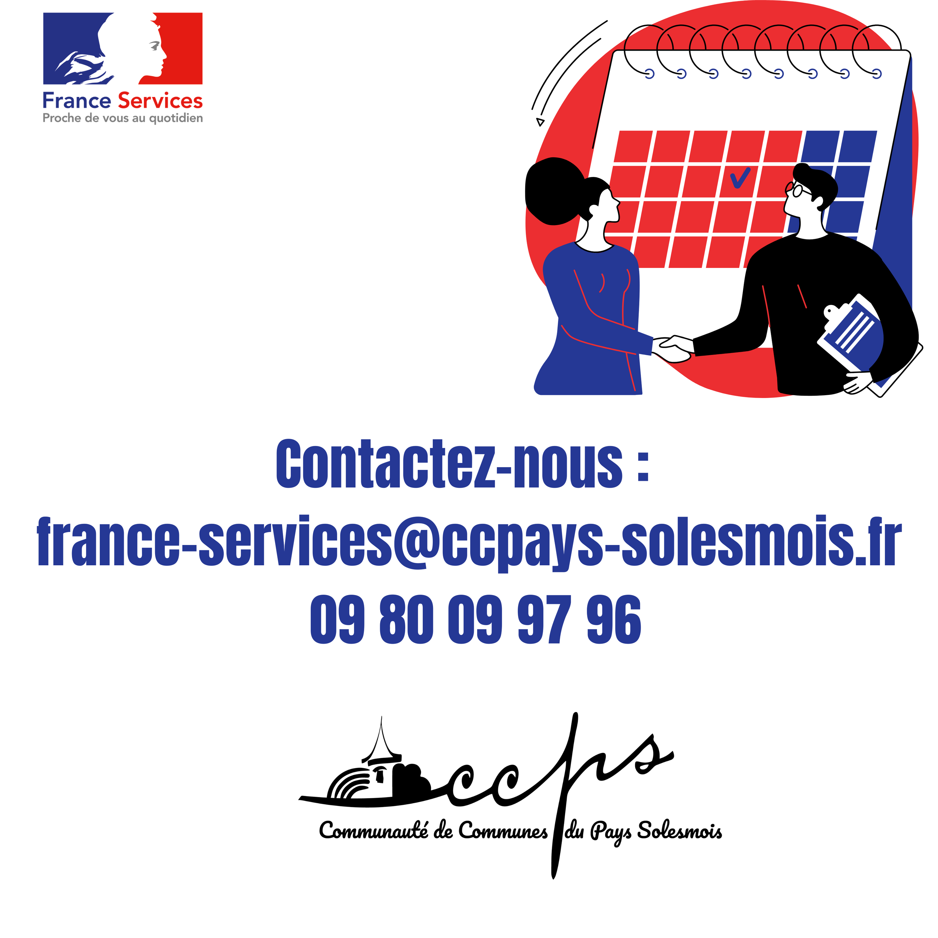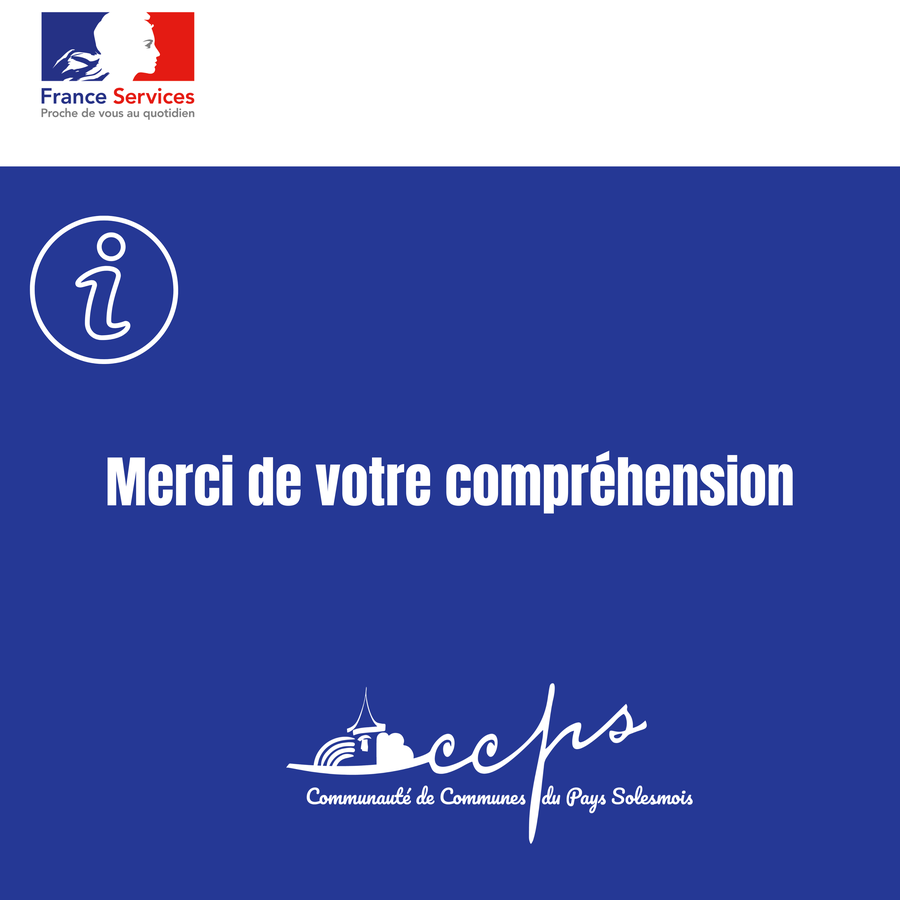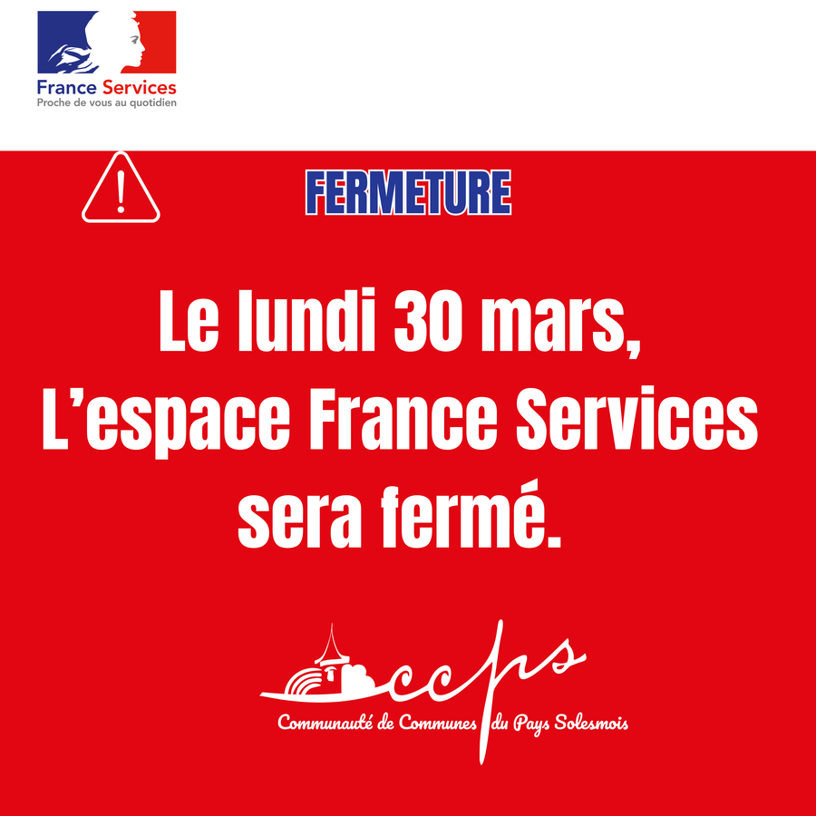 L’Espace France Services – CCPS sera exceptionnellement fermé le lundi 30 mars. Nous vous remercions pour votre compréhension.