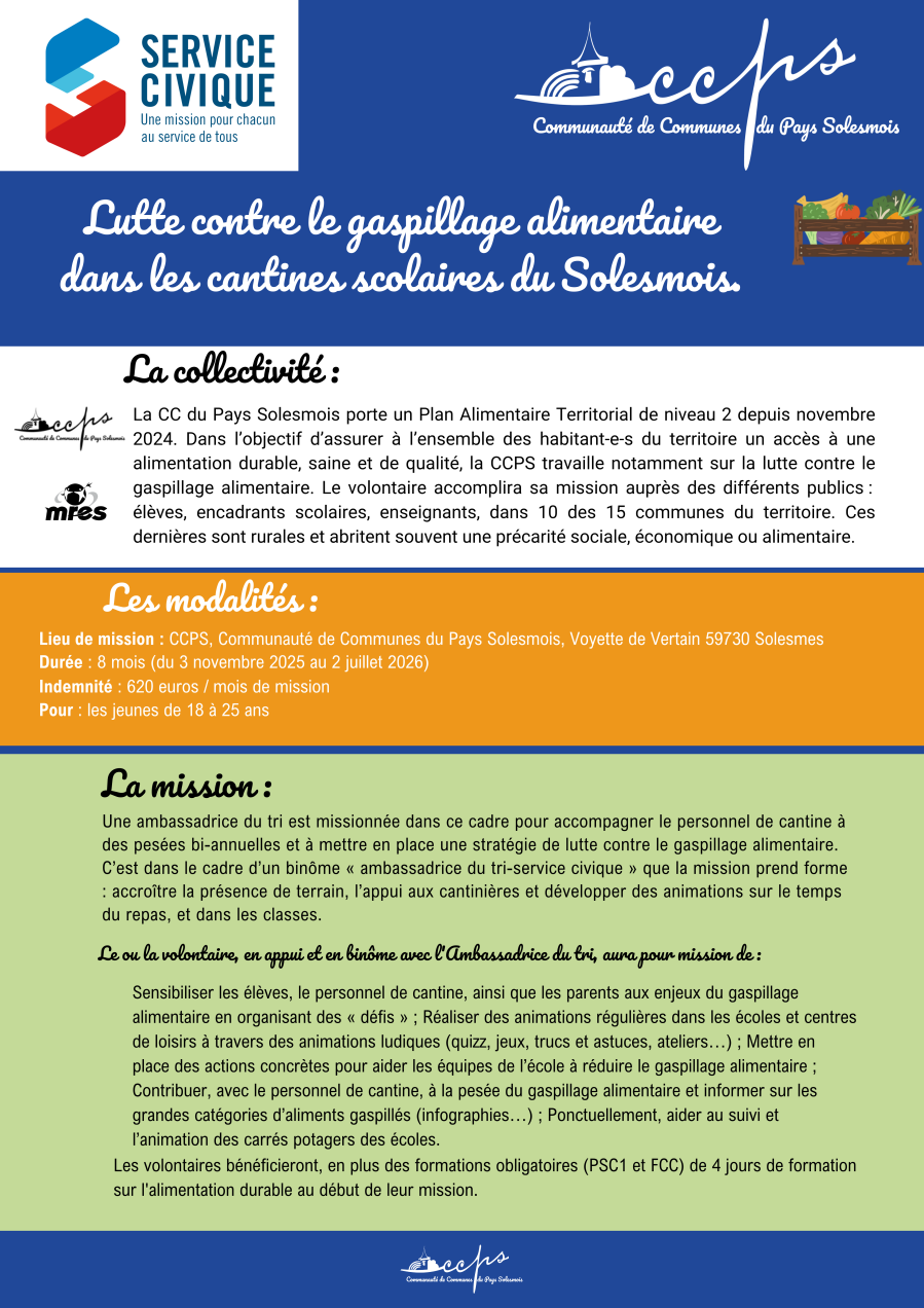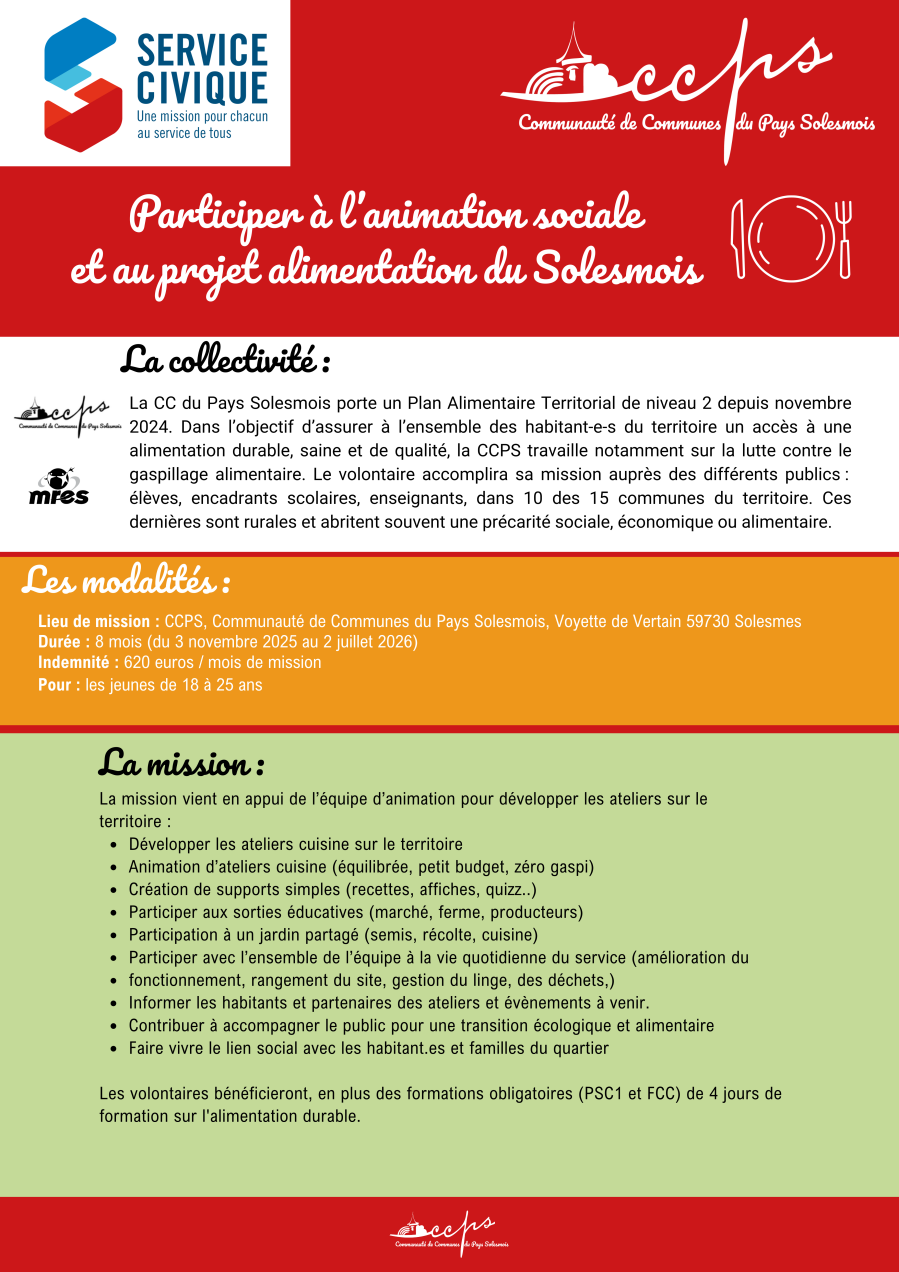 👉 Rejoins la Communauté de Communes du Pays Solesmois pour accompagner des actions autour de l’alimentation : animations, sensibilisation, projets avec les habitants, les écoles ou les producteurs locaux 🍽️🤝