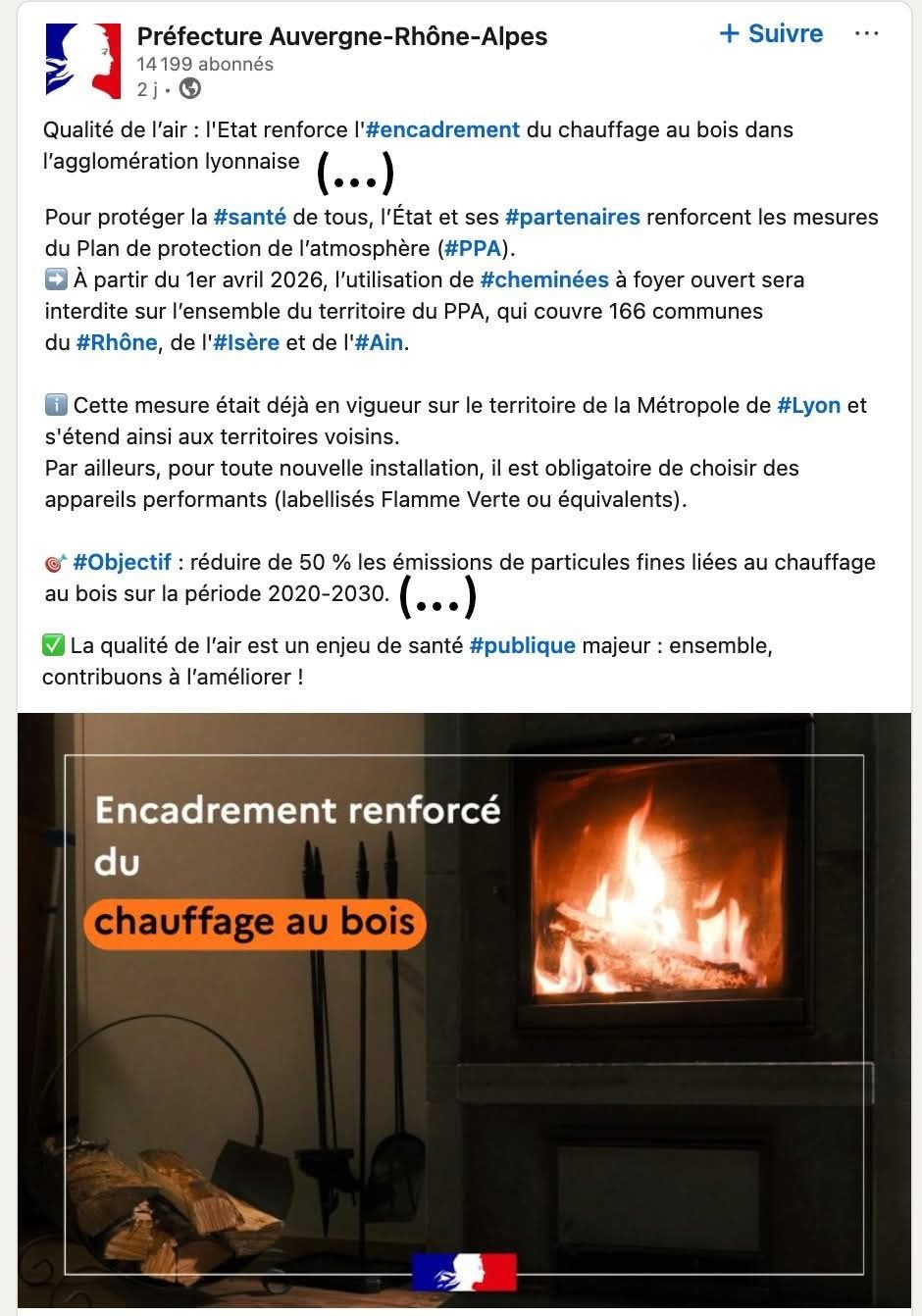 ➡️ Depuis le 1er avril 2026, l’utilisation de cheminées à foyer ouvert est interdite sur les communes d'Entre Bièvre et Rhône dans le cadre du plan de protection de l'Atmosphère (PPA) de l'agglomération lyonnaise.