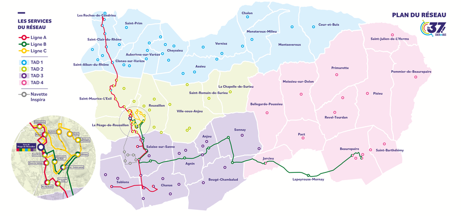🚌 Le réseau de transport en commun le 37 couvre les 37 communes d'Entre Bièvre et Rhône, avec
