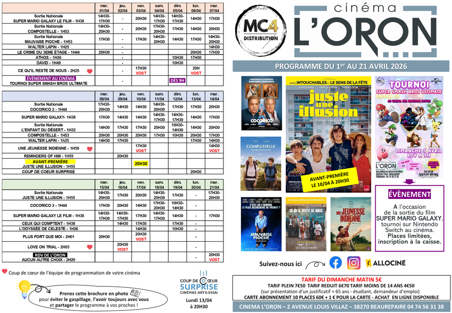 Voir programme en pièce jointe ou en ligne : https://cinema-oron.fr/FR/9/cinema-beaurepaire-l-oron-beaurepaire.html