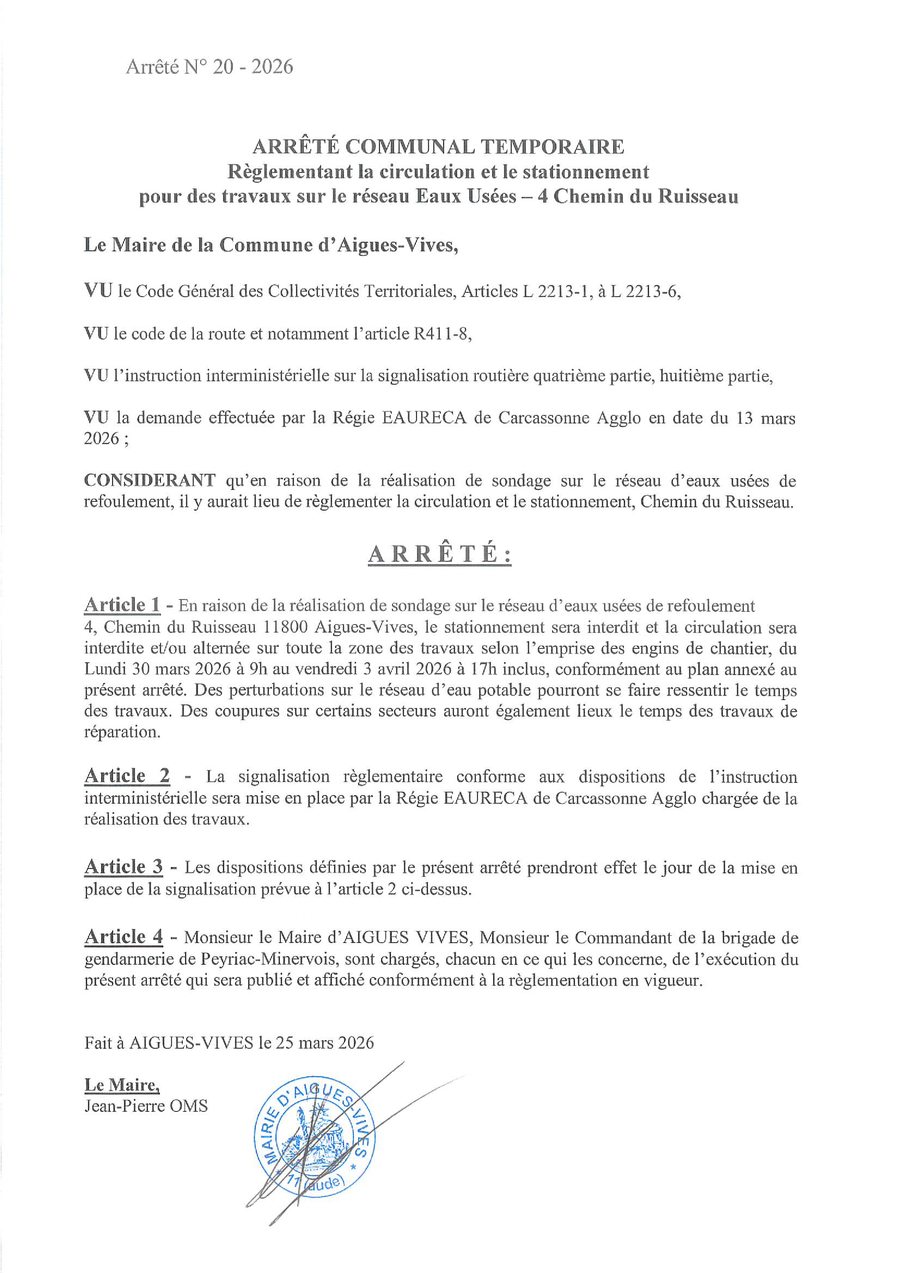 le stationnement sera interdit et la circulation sera interdite et/ou alternée sur toute la zone des travaux selon l'emprise des engins de chantier,