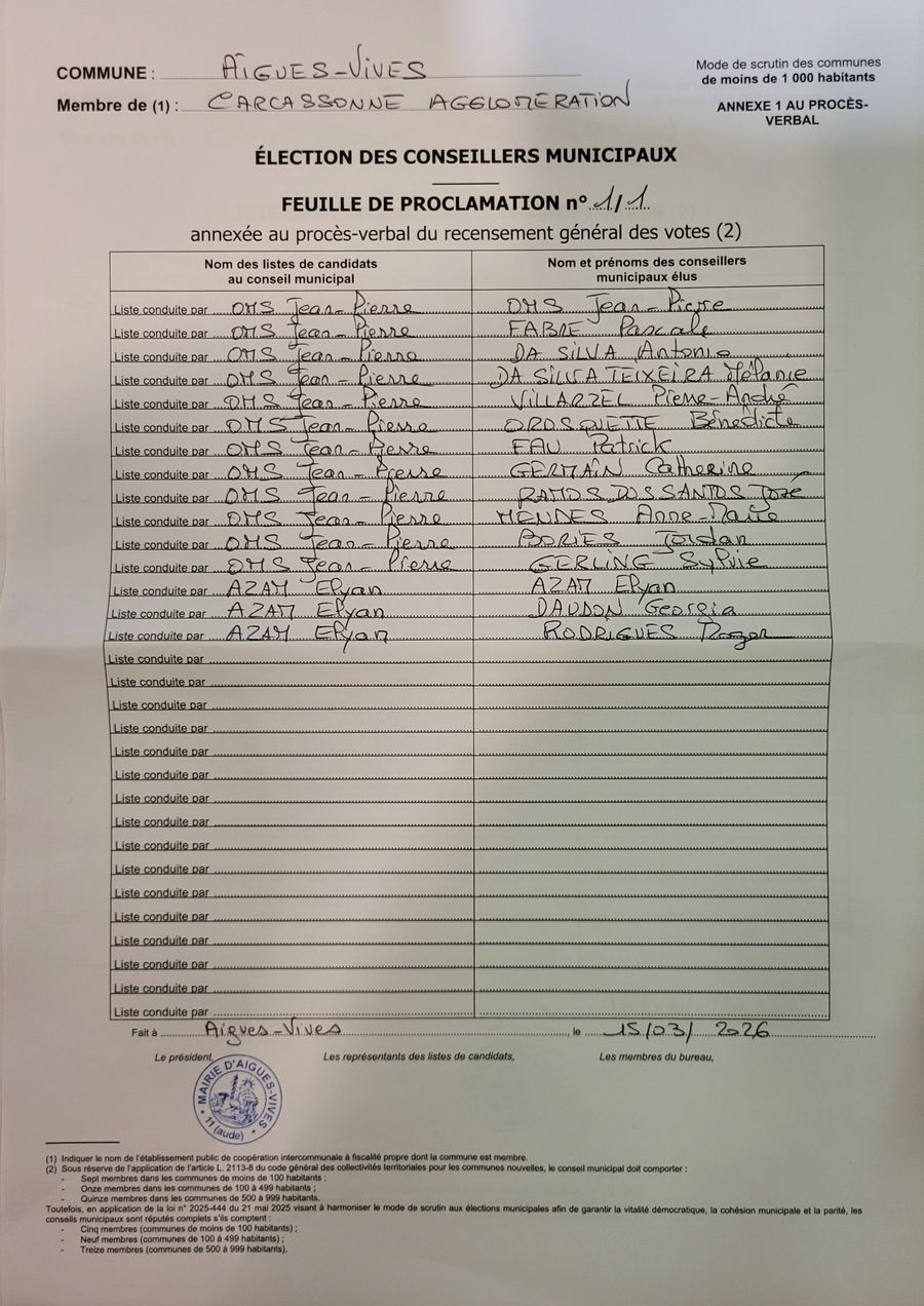 Le président du bureau, M OMS Jean-Pierre a proclamé élues les personnes figurant sur cette feuille de proclamation 👇
