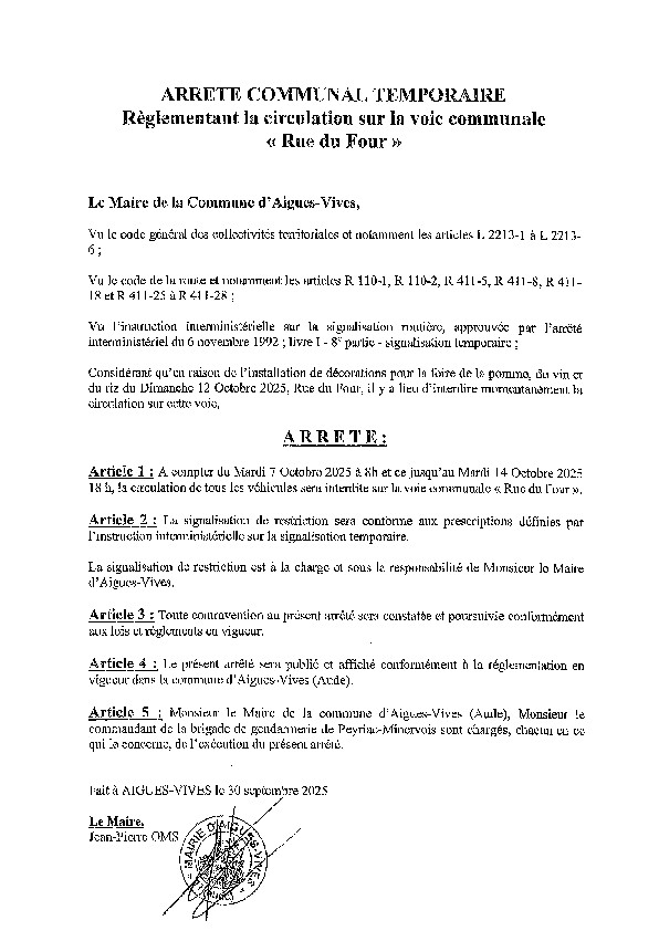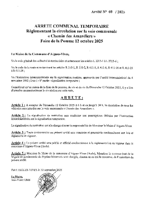 En raison de la Foire de la Pomme, du Vin et du Riz , le "Chemin des Amandiers" sera fermé et interdit à la circulation