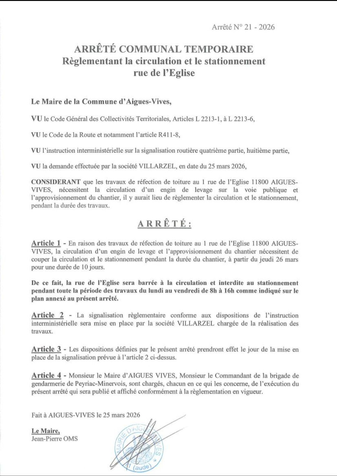 En raison des travaux de réfection de toiture au 1 rue de l'Eglise, la circulation d'un engin de levage et l'approvisionnement du chantier nécessitent de couper la circulation et le stationnement pendant la durée du chantier, à partir du jeudi 26 mars pour une durée de 10 jours.