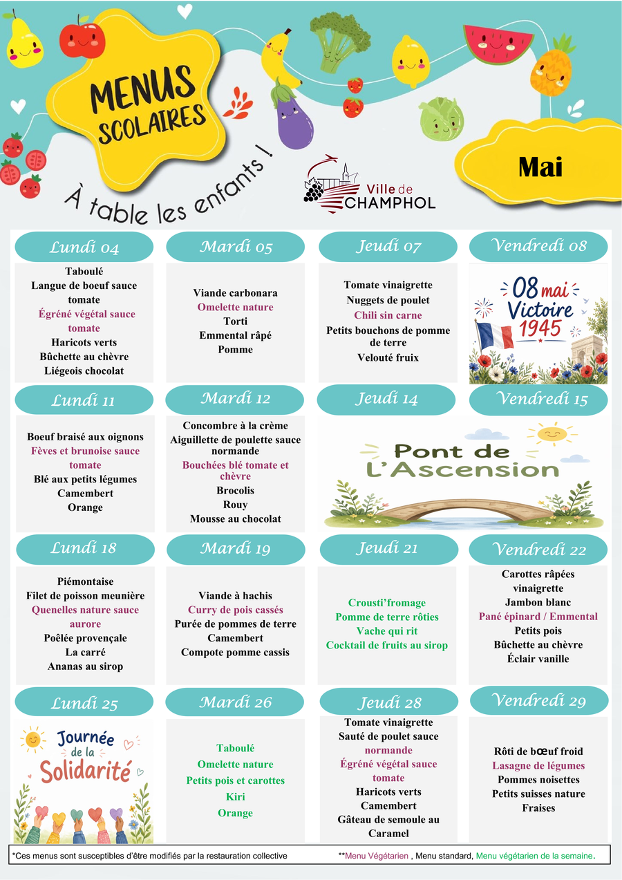 Découvrez ci-après les menus prévus au restaurant scolaire pour le mois de mai