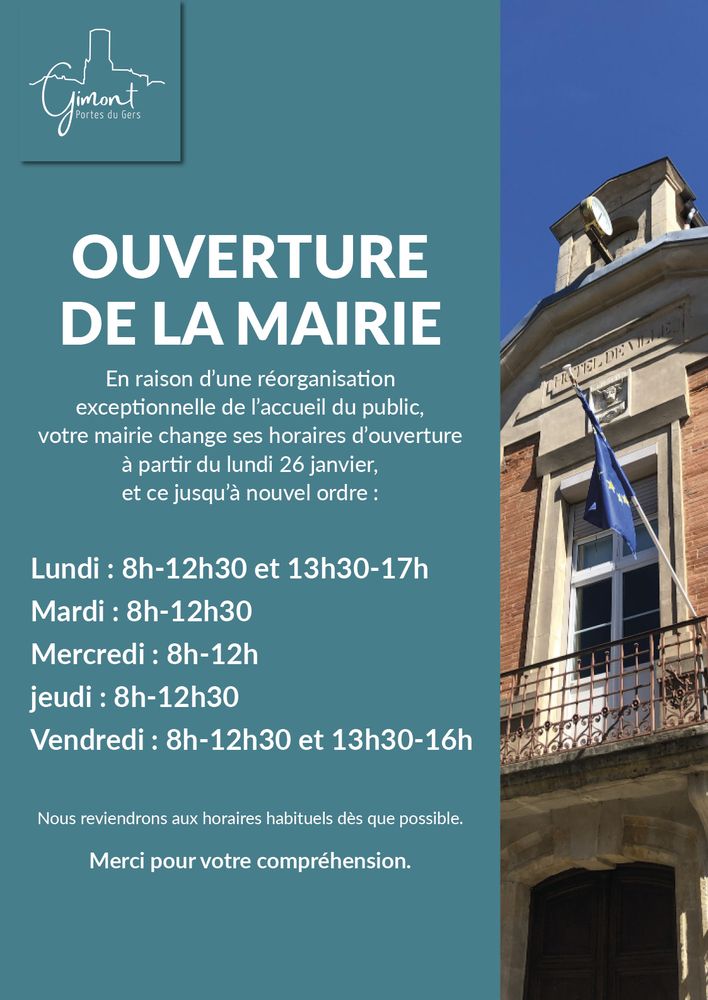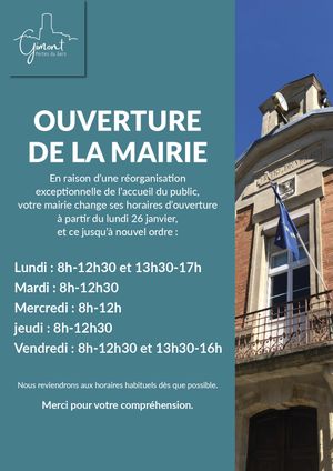 En raison d’une réorganisation exceptionnelle de l’accueil du public, votre mairie change ses horaires d’ouverture à partir du lundi 26 janvier, et ce jusqu’à nouvel ordre :