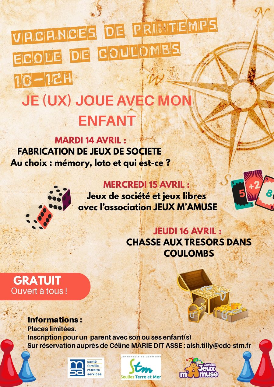 Ces ateliers se dérouleront à l'école de Coulombs du mardi 14 au jeudi 16 avril de 10h à 12h.