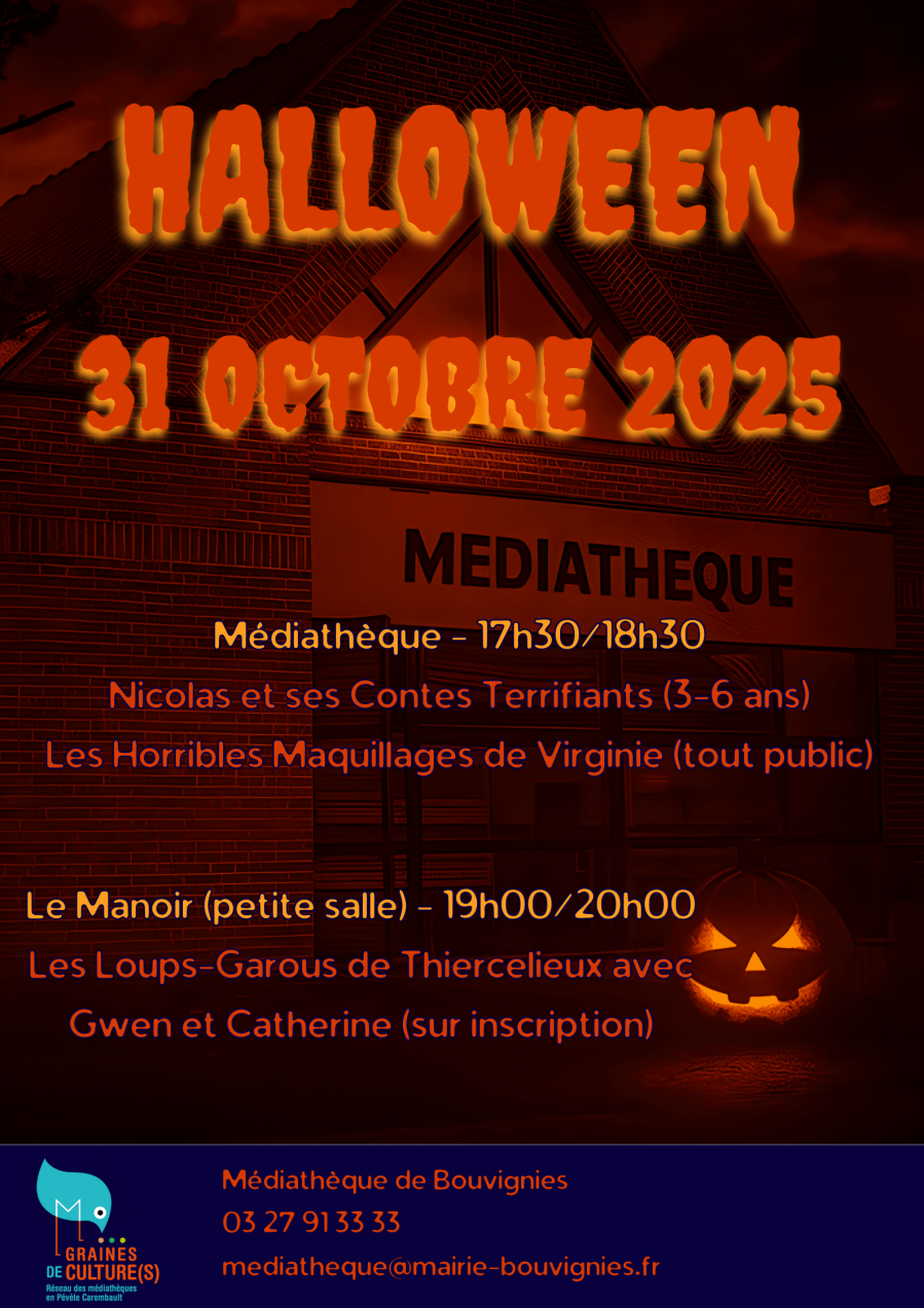 Rendez-vous à la médiathèque municipale à 17h30, puis participez au défilé, puis activité "Loup-Garous" au manoir jusqu'à 20h !