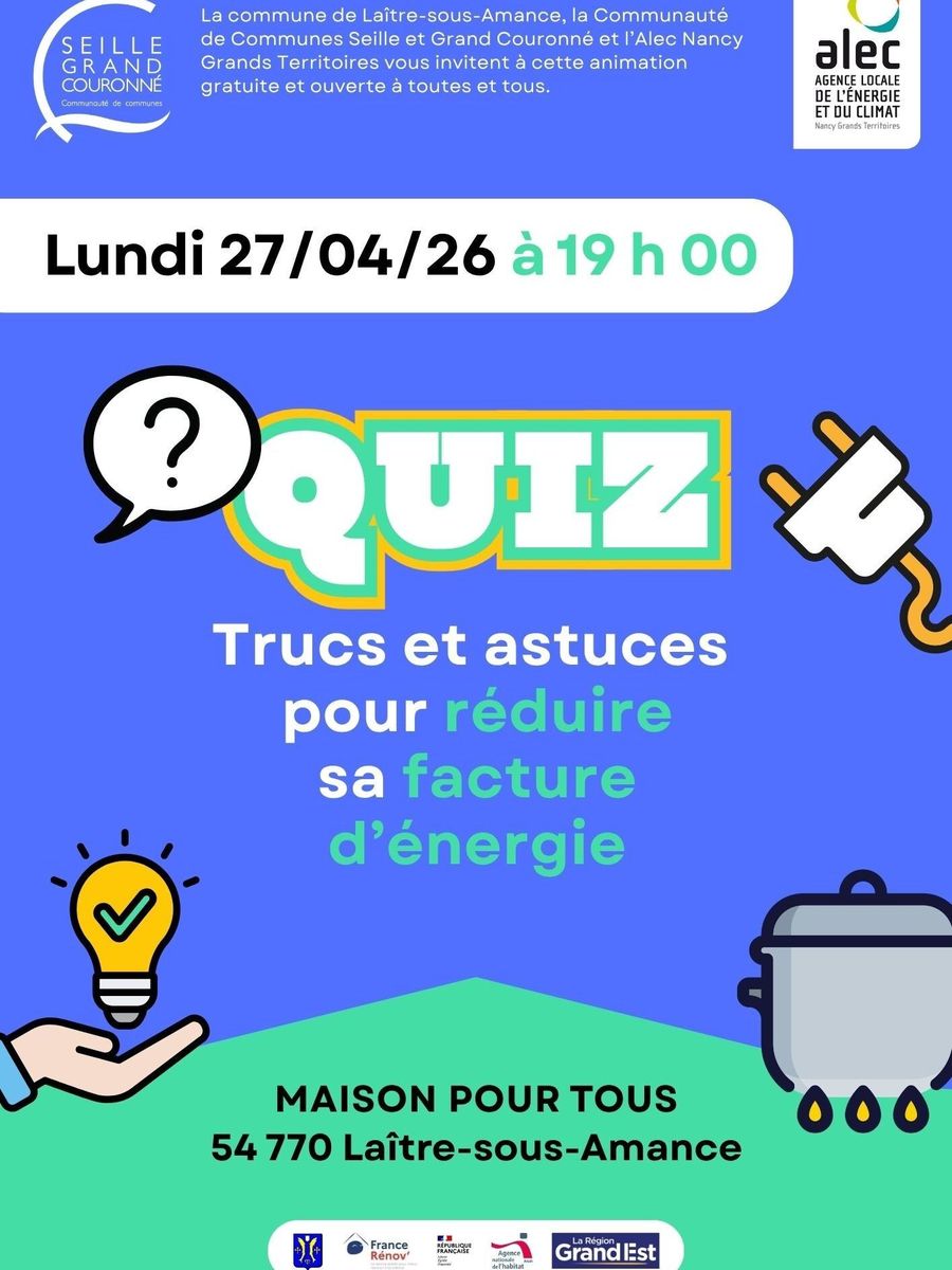 L’Espace Conseil France Rénov de l’ALEC et la Communauté de Communes Seille et Grand Couronné en partenariat avec la commune de Laitre-sous-Amance vous invitent à une animation sur les économies d’énergie. Venez apprendre tous les trucs et astuces pour réduire vos factures en participant et jouant à un quiz interactif (type QCM). Les meilleurs rapporteront des petits lots permettant de réduire les consommations d’énergie et d’eau.