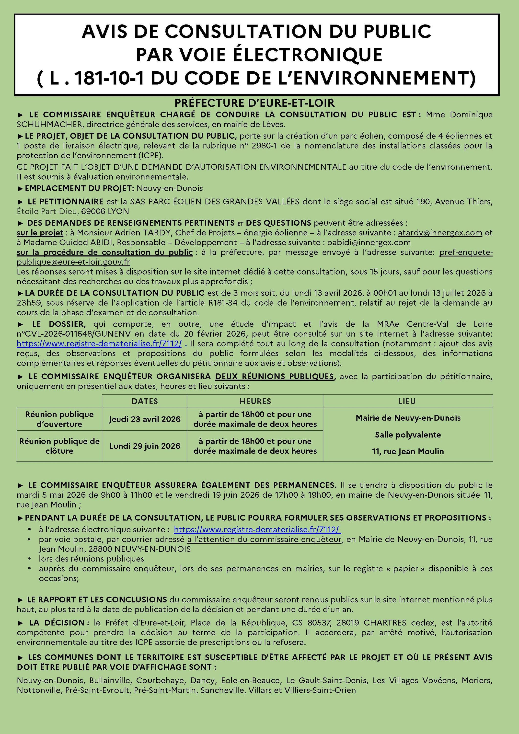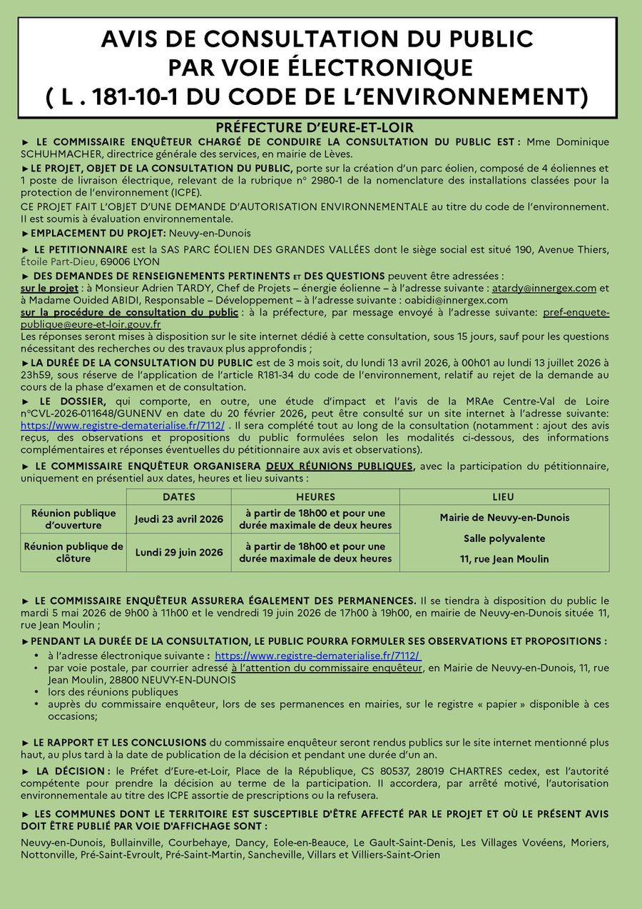 La commune des Villages Vovéens informe ses habitants de l’ouverture d’une consultation du public concernant un projet de parc éolien situé sur la commune de Neuvy-en-Dunois.
