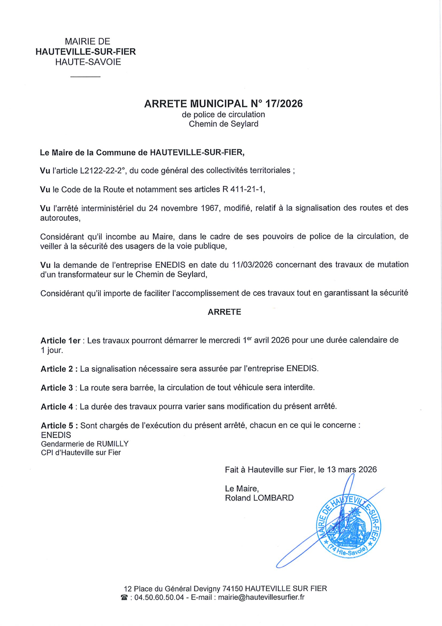 Le 01 Avril 2026, ENEDIS va effectuer des travaux de mutation d'un transformateur sur le Chemin de Seylard à Hautevillette.