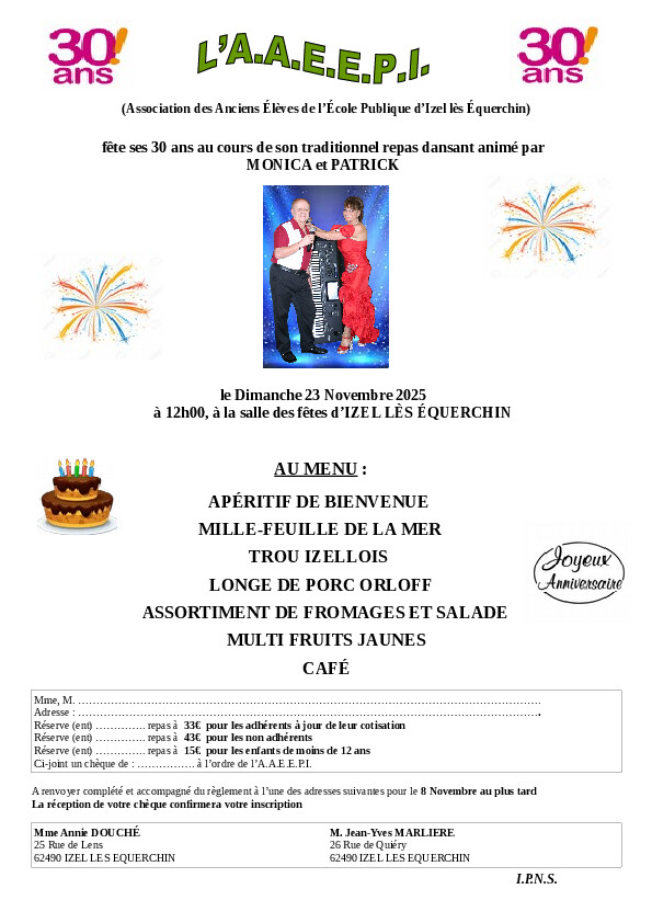 L'A.A.E.E.P.I. organise son repas dansant le dimanche 23 novembre 2025 à 12h00.