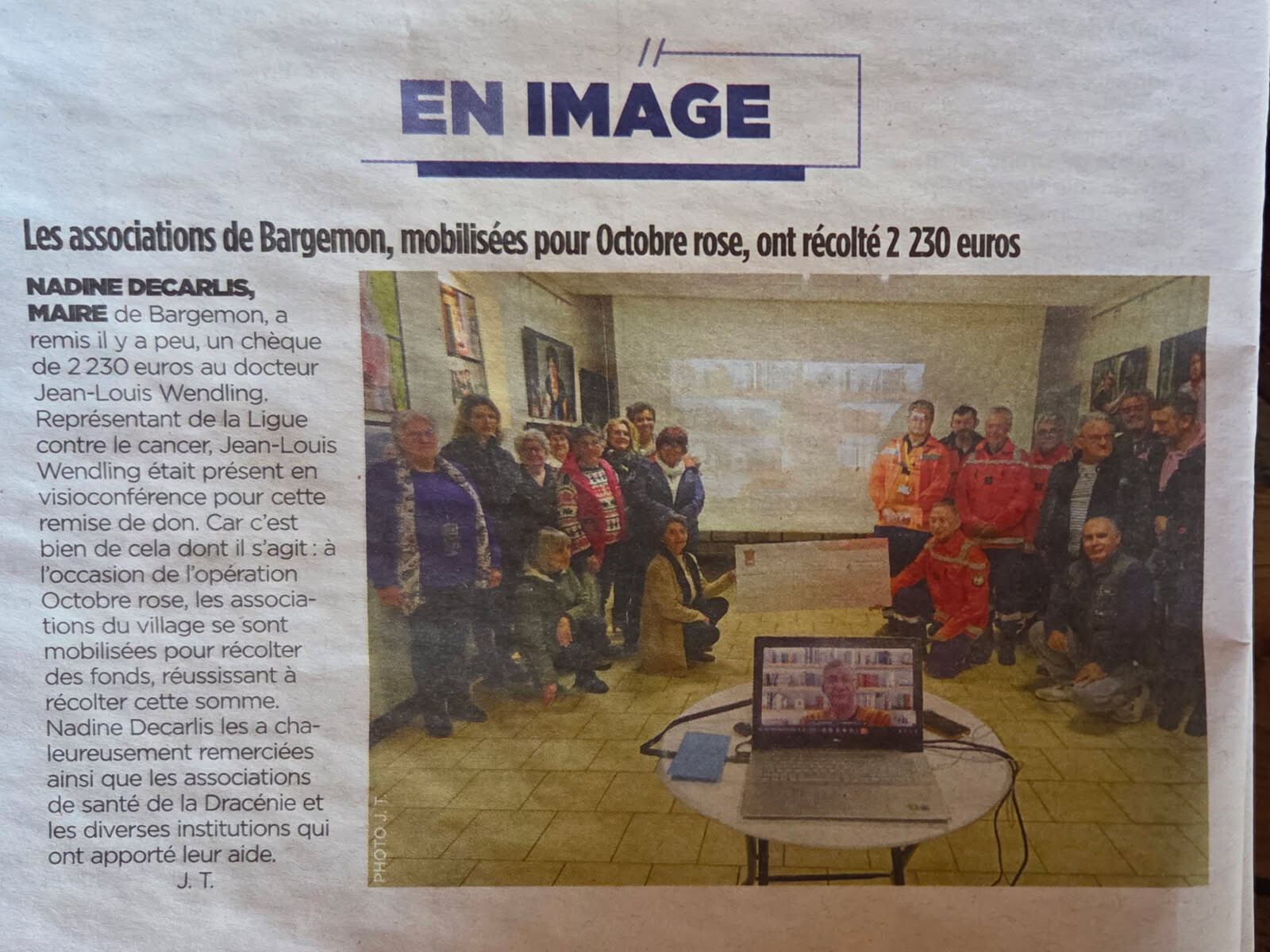 La Mairie de Bargemon tient à remercier chaleureusement les associations qui se sont mobilisées pour l'opération Octobre Rose et qui ont contribué à récolter la somme de 2230 euros au profit de la Ligue contre le Cancer, représentée par le Dr. Jean-Louis Wendling.