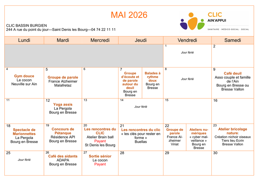 Voici le calendrier des actions de prévention pour le mois de mai 2026. Plus d'info.