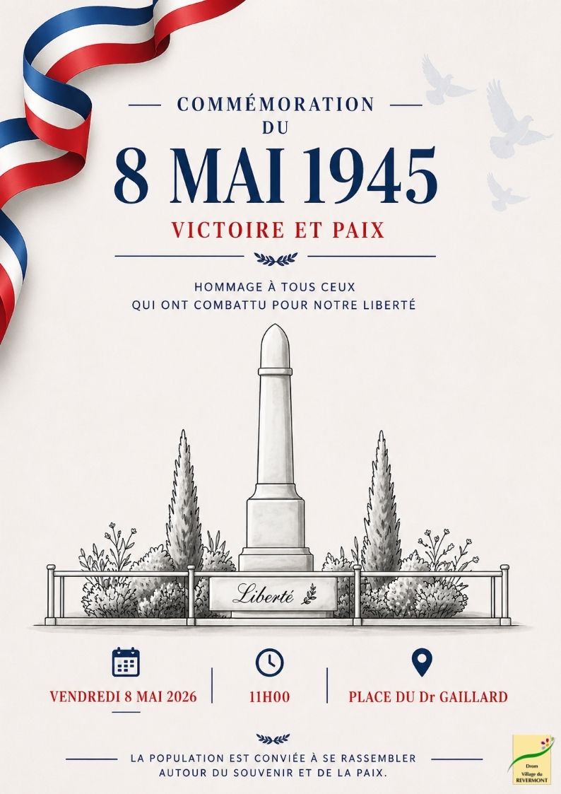 🇫🇷 Le Maire ainsi que l'ensemble de son équipe ont le plaisirs de vous convier à la cérémonie de commémoration du 8 mai 1945 qui aura lieu le vendredi 8 mai 2026 à 11h.