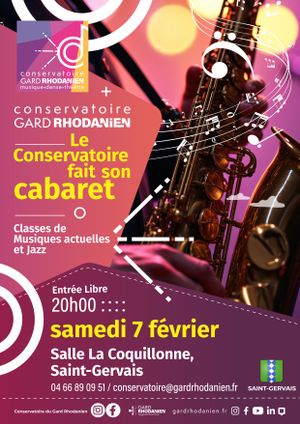 Samedi 7 février : Le conservatoire fait son Cabaret, à 20h à la Coquillonne St Gervais. Avec les classes de Musiques Actuelles et Jazz.