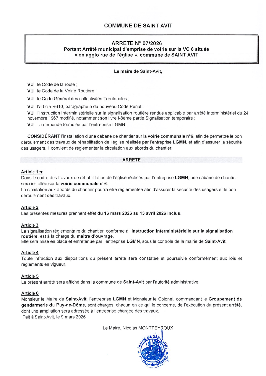 Afin d’assurer le bon déroulement des travaux et garantir la sécurité des usagers, un arrêté municipal provisoire a été pris pour réglementer la circulation aux abords du chantier.