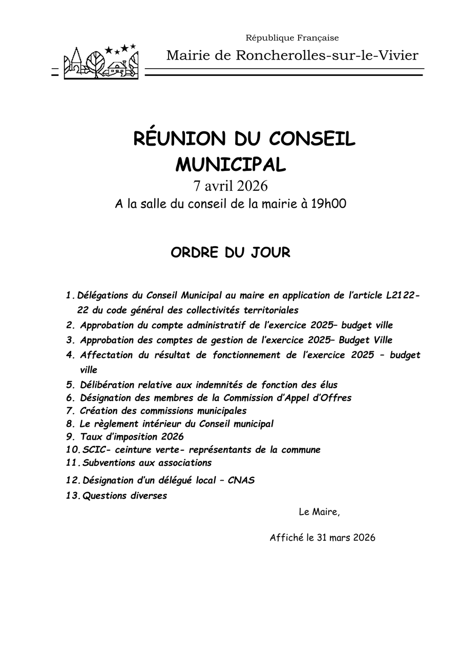 Vous trouverez ci-dessous l'ordre du jour du Conseil municipal du mardi 7 avril 2026,