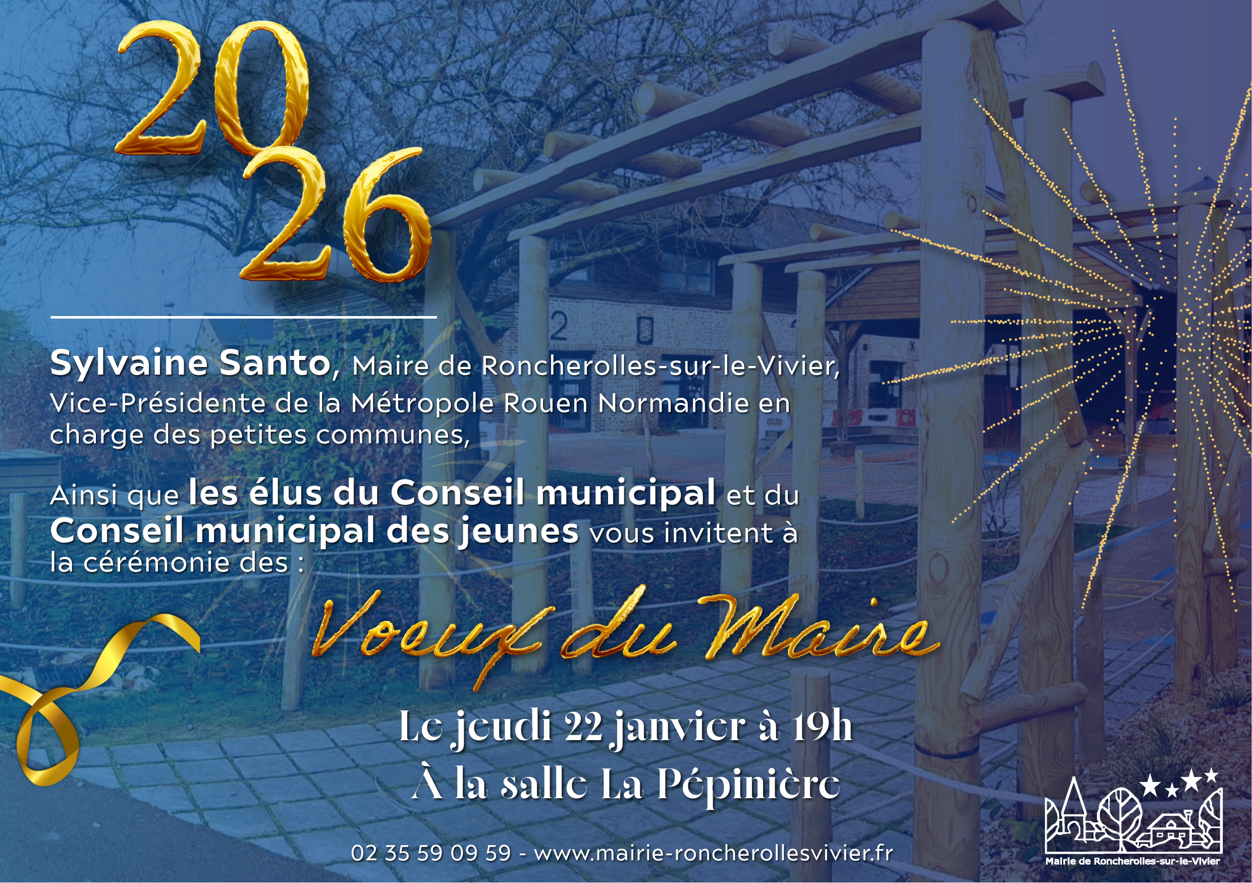 La Municipalité de Roncherolles-sur-le-Vivier invite chaleureusement l’ensemble des habitants à partager un moment convivial à l’occasion des vœux du Maire, jeudi 22 janvier à 19h, à la Pépinière.