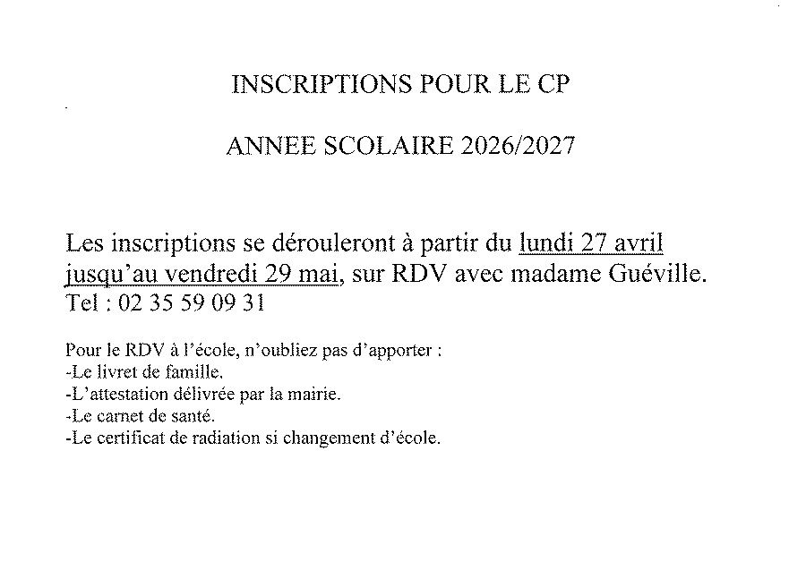 Les inscriptions pour la classe de CP se dérouleront à partir du lundi 27 avril et jusqu'au vendredi 29 mai, sur RDV.