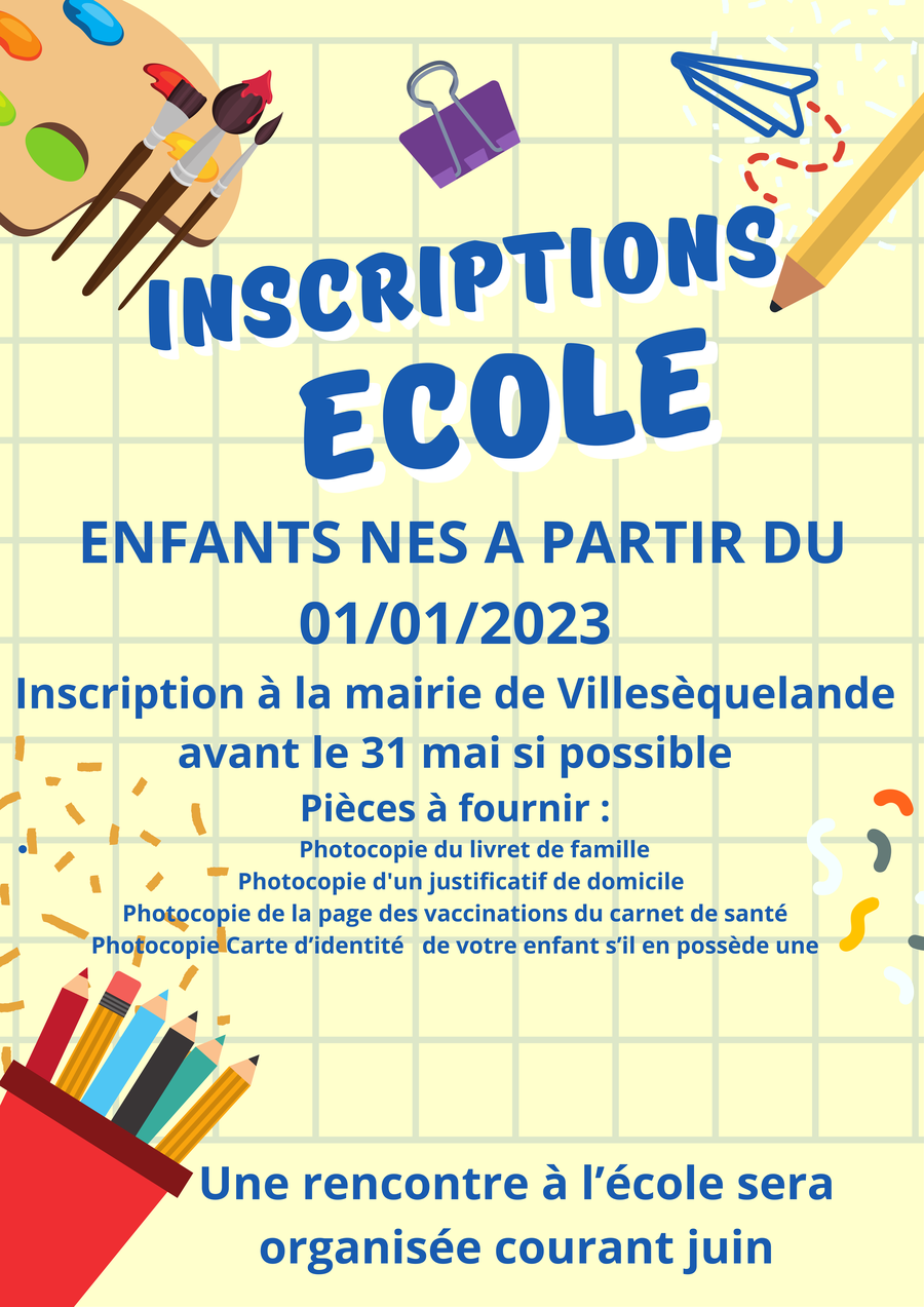 Ouverture des inscriptions à l'école pour les enfants né à partir du 01/01/2023.