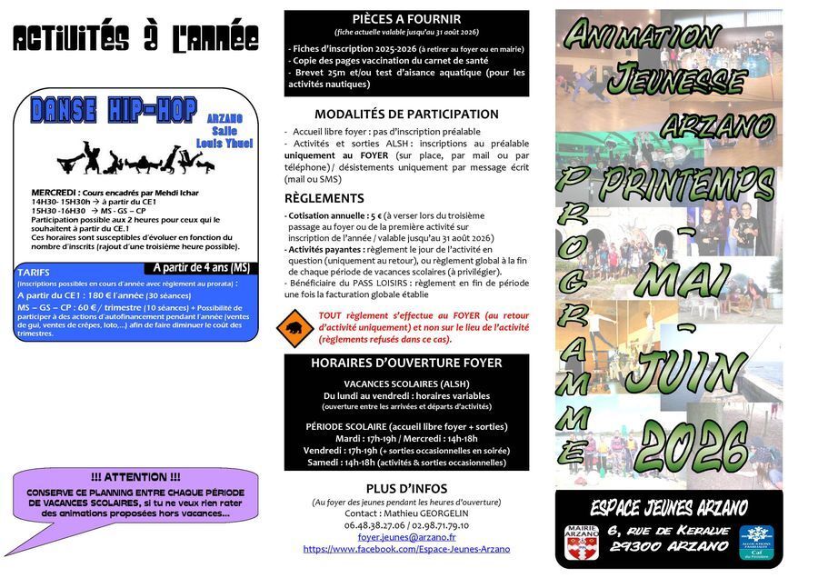 Inscriptions possibles dès maintenant (mail, téléphone ou sur place aux horaires d'ouverture du foyer).