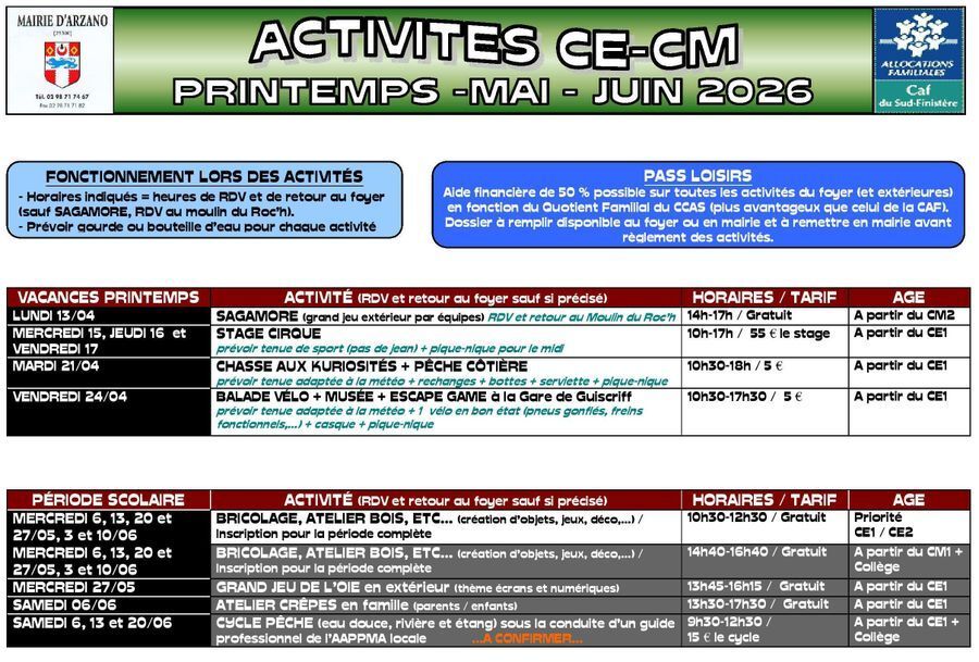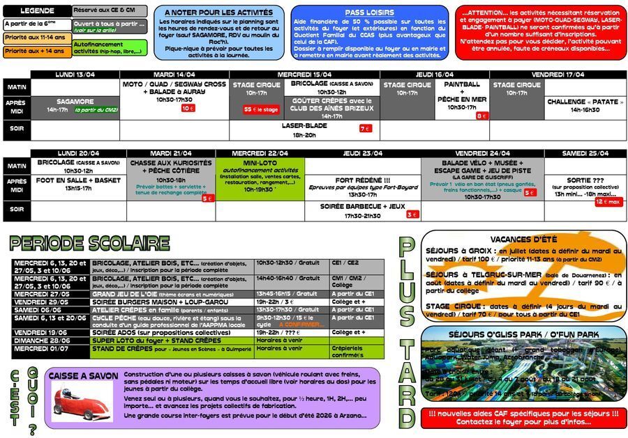Voici les planning des vacances de printemps et des mois de mai / juin.