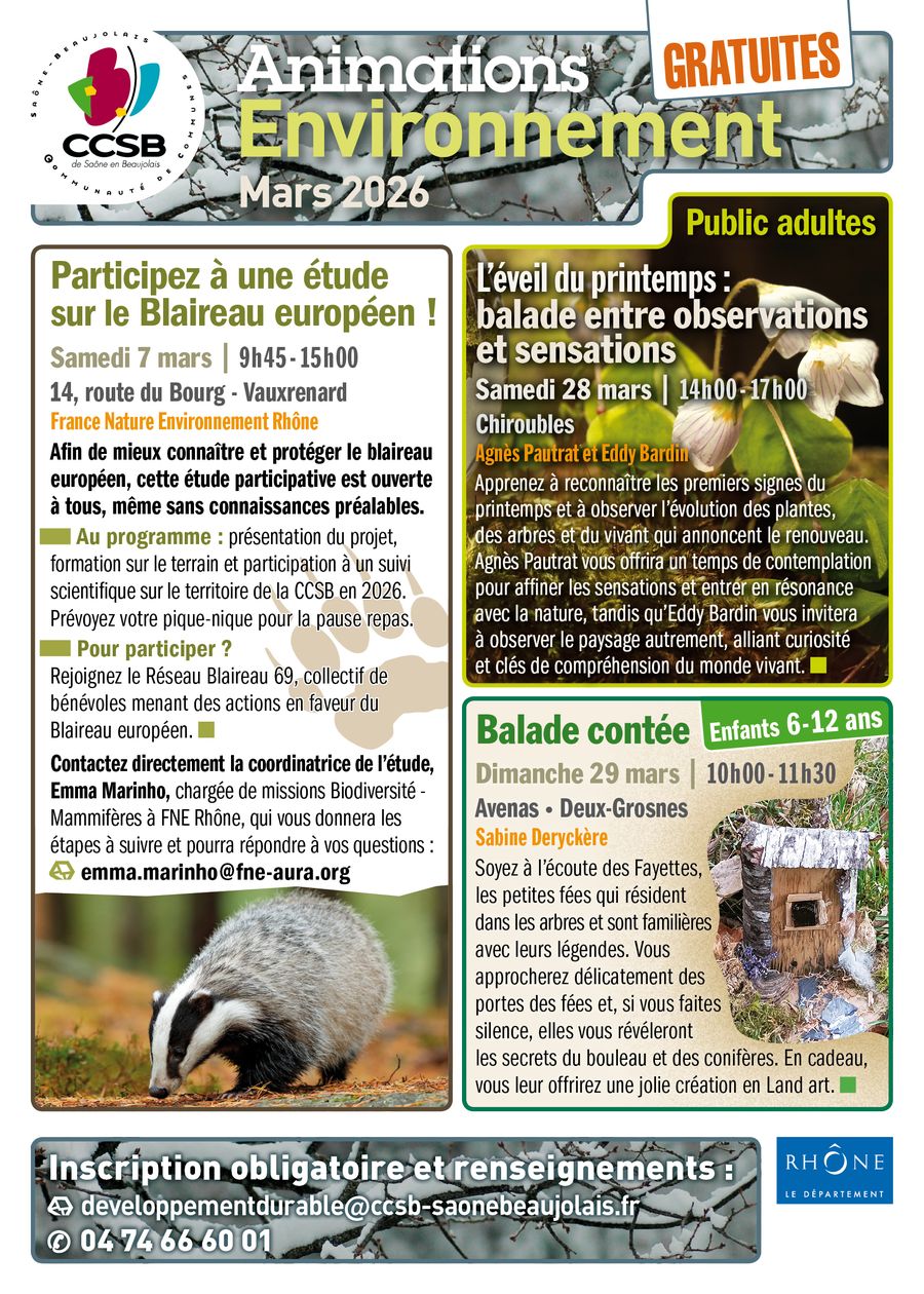 Pour rappel, les animations sont gratuites et les places limitées. L’inscription est obligatoire par téléphone 04 74 66 60 01 ou par mail developpementdurable@ccsb-saonebeaujolais.fr