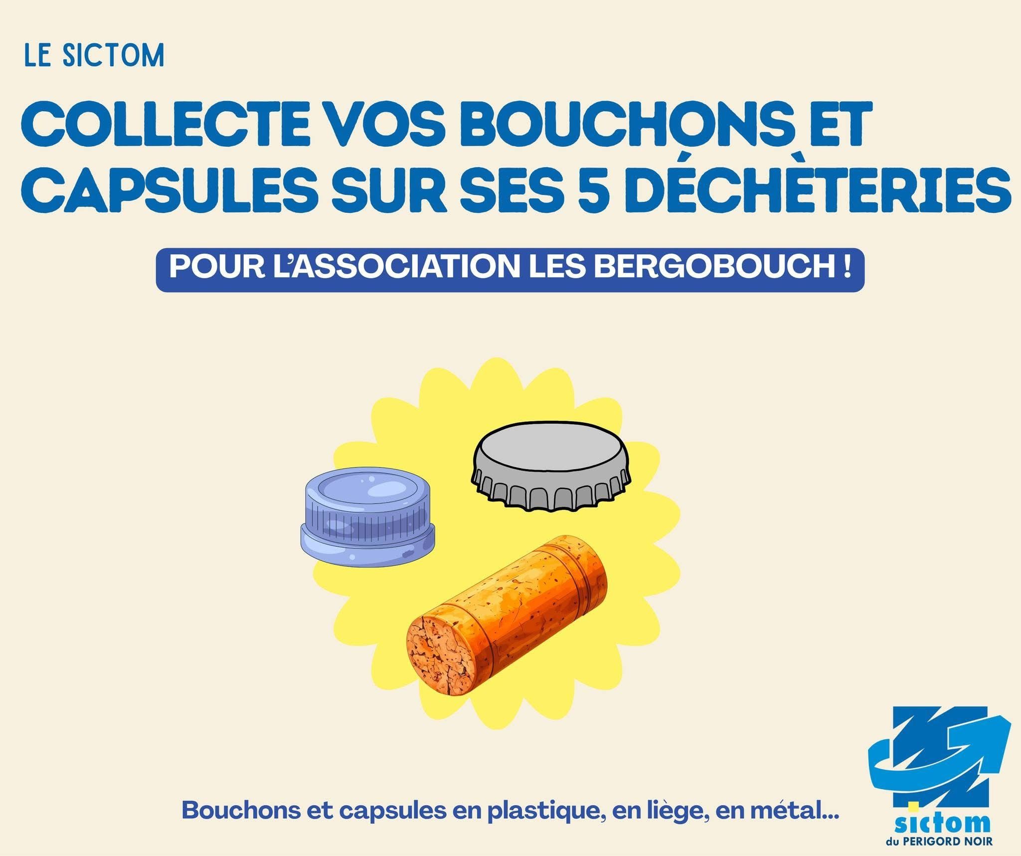 📍 Vous pouvez déposer vos bouchons dans les déchèteries de : Sarlat, Cénac, Montignac, Carlux et Saint-Crépin (et aussi à l’épicerie de Salignac).