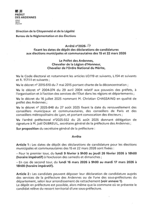 Arrêté fixant les dates de dépôt des déclarations de candidatures aux élections municipales et communautaires des 15 et 22 mars 2026