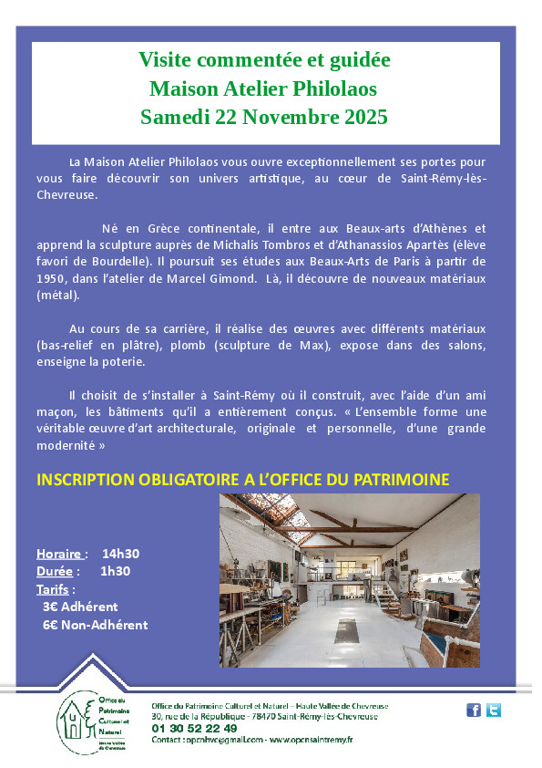 L'Office du Patrimoine de Saint-Rémy-lès-Chevreuse vous propose une visite commentée et guidée de la Maison Atelier Philolaos le samedi 22 novembre à 14h30 ainsi que de la Fonderie d'art de Dourdan le samedi 6 Décembre à 14h30.