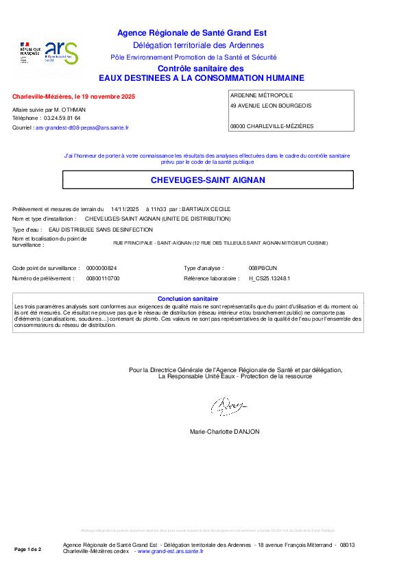 L’Agence Régionale de Santé (ARS) Grand Est a réalisé un contrôle de l’eau le 14 novembre 2025 sur notre réseau de distribution.