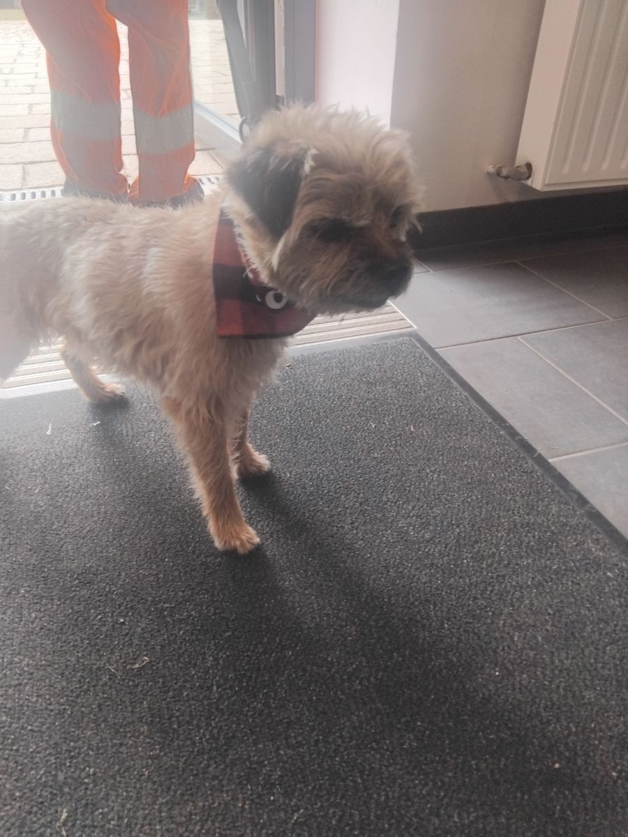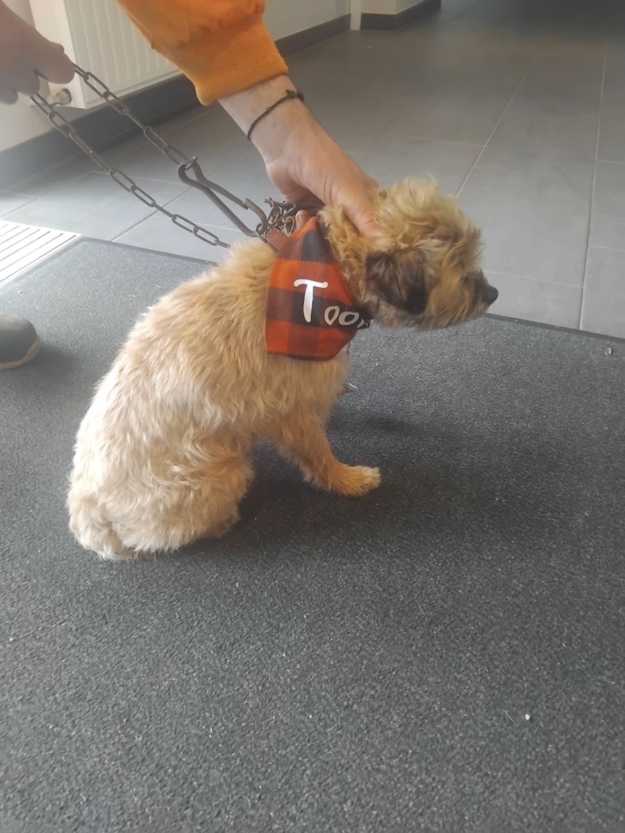 Ce petit chien avec un foulard rouge et noir recherche son propriétaire.