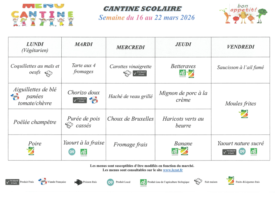 🍎🥪MENUS CANTINE DU 16 AU 20 MARS 2026🌭🍎