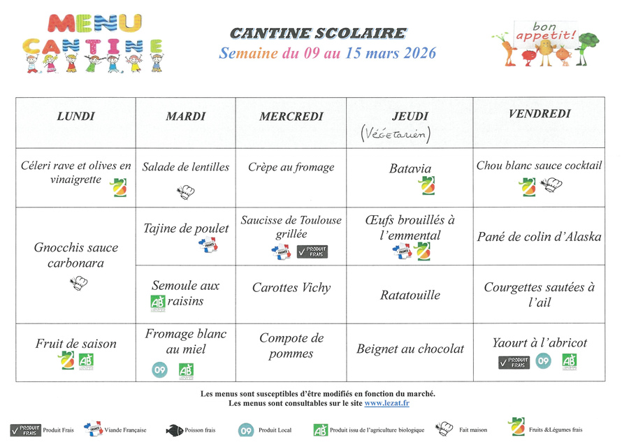 🥞🍟MENUS CANTINE DU 09 MARS AU 13 MARS 2026🍗🍰