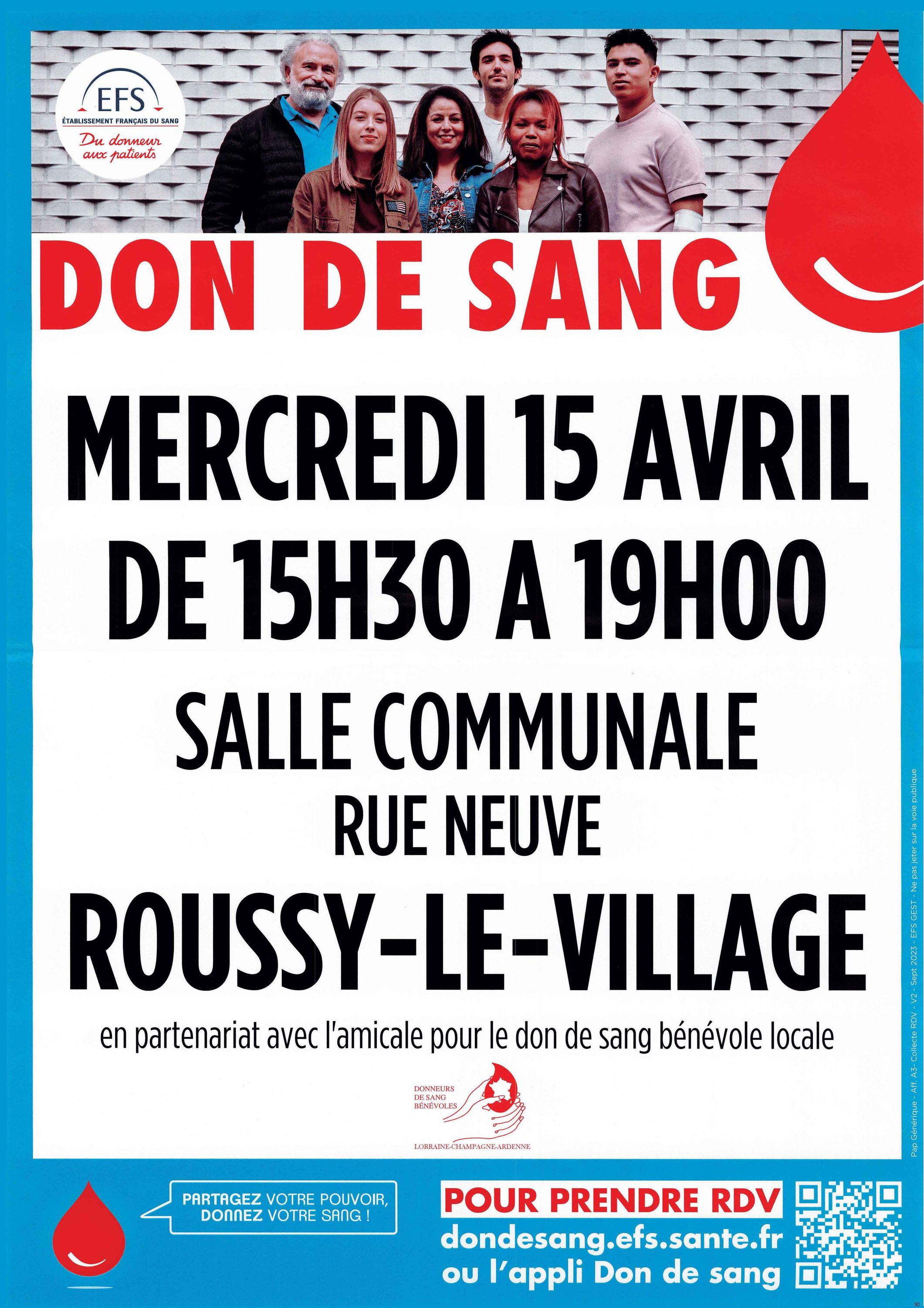 Une collecte de sang est organisée à Roussy-le-Village le mercredi 15 avril, de 15h30 à 19h00, à la Salle communale, rue Neuve.