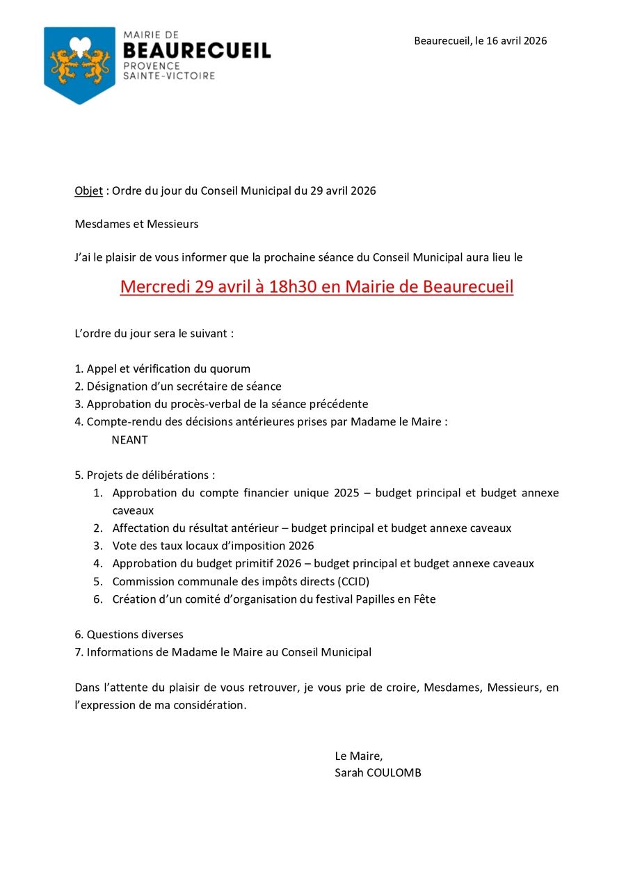 Chers administrés, nous vous informons que le prochain conseil municipal aura lieu le mercredi 29 avril à 18h30 en mairie, il sera consacré notamment au budget 2026.