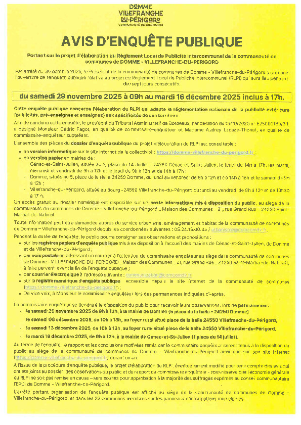 Tout comme le dossier d’enquête, ils sont accessibles à l’accueil des mairies de Cénac-et-Saint-Julien, de Domme et de Villefranche-du-Périgord, aux horaires d’ouverture.