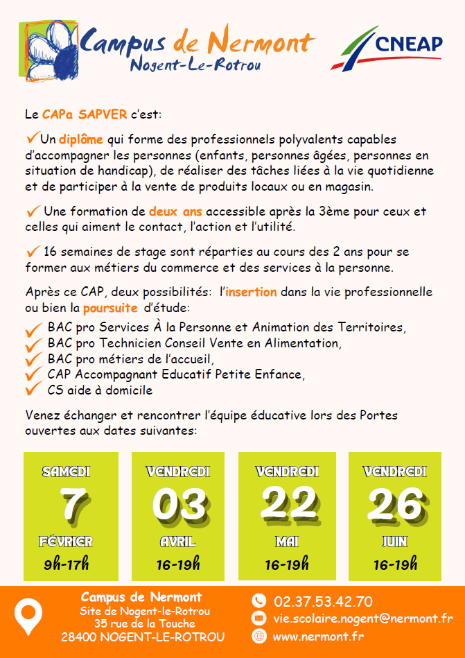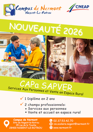 Nouvelle formation CAPa SAPVER (Services Aux Personnes et Vente en Espace Rural), destinée aux jeunes souhaitant s’orienter vers les métiers du service à la personne et/ou de la vente. Venez en savoir plus lors de nos Portes Ouvertes !