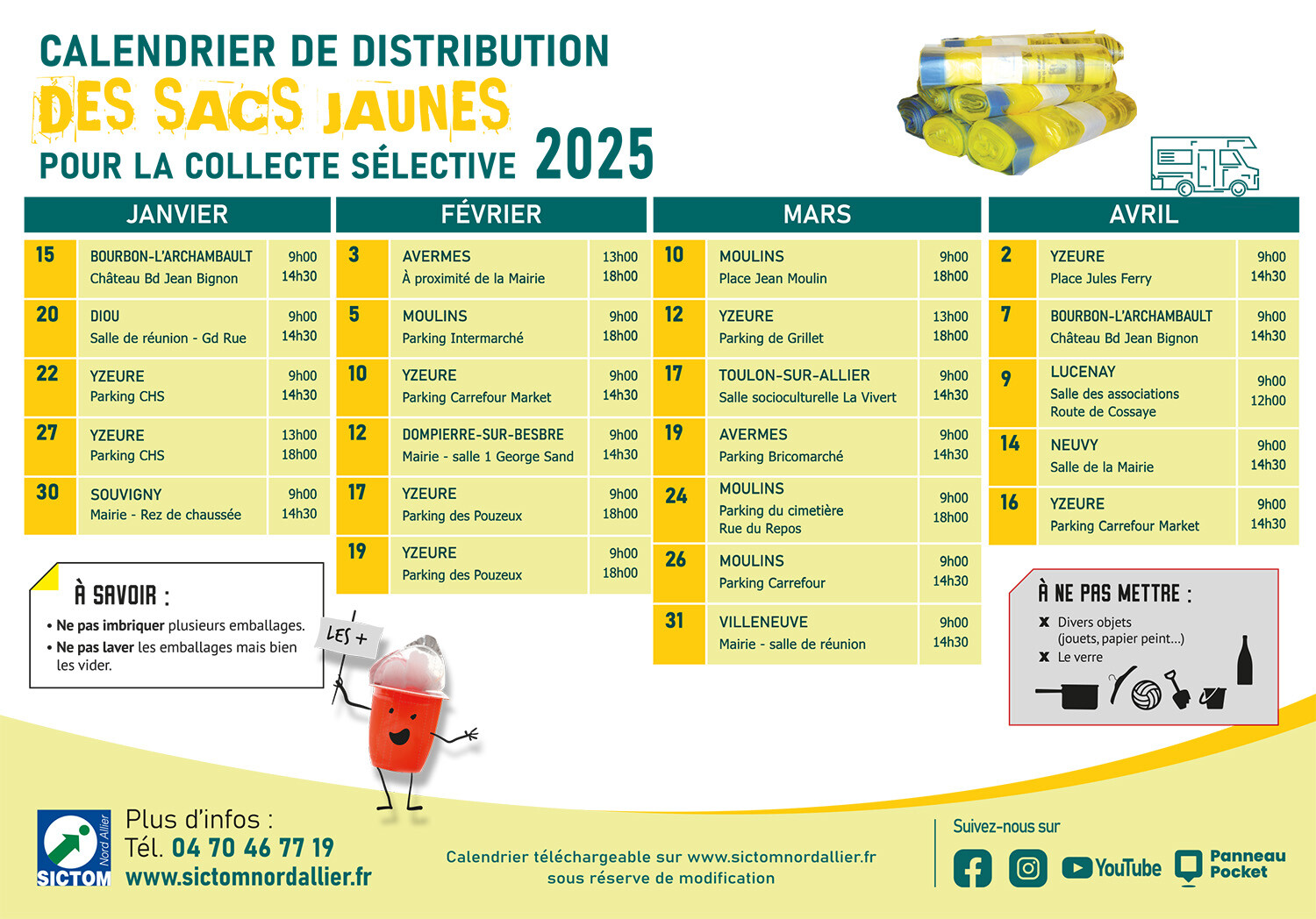👉 Pensez-bien à récupérer votre dotation annuelle de sacs jaunes, soit au magasin du SICTOM Nord Allier (du lundi au vendredi de 8h30 à 16h30 non-stop), soit au camping-car itinérant, muni de votre justificatif de domicile ! 😉