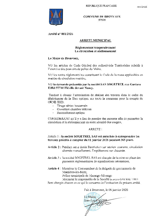 La société SAS SOGETREL interviendra sur toute la commune pour le compte de ORNETHD dans le cadre de la fibre optique