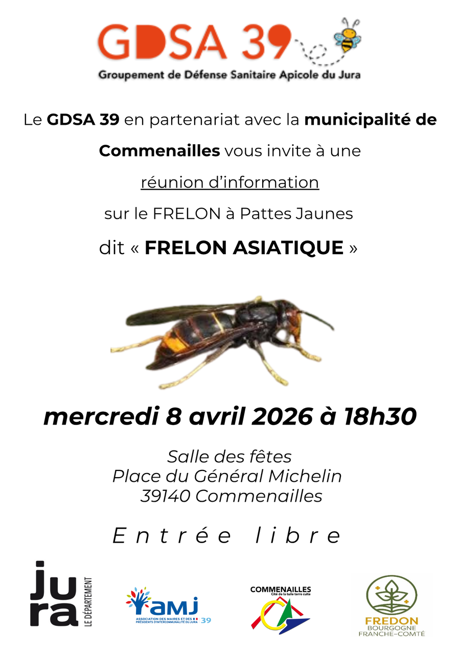 Le GDSA39, Groupement de Défense Sanitaire Apicole du Jura. organise à la salle des fêtes de Commenailles une session d'information concernant le frelon asiatique, mercredi 8 avril à 18h30, l'entrée est libre et ouverte à tous sans inscription préalable.