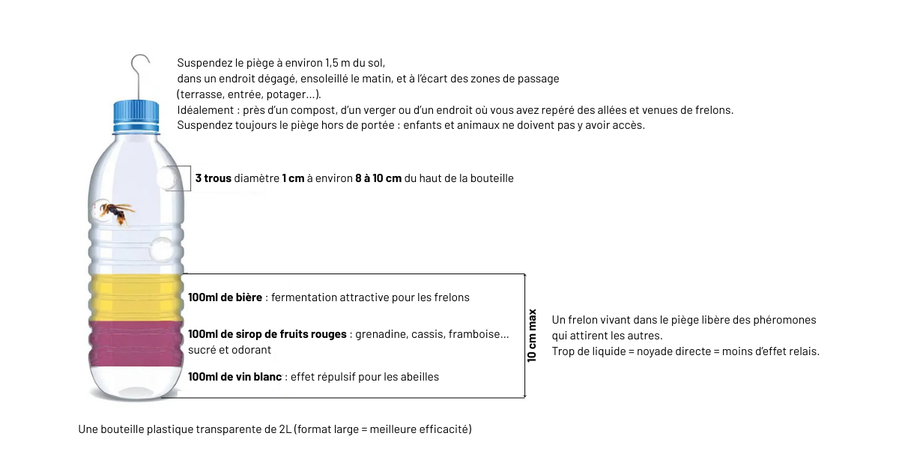 Pour cela, il s’agit de construire un piège à frelons asiatiques à partir d’une bouteille en plastique. Notons que quand le piège est plein, il faut le vider et rajouter du liquide, sans le laver car ce sont les phéromones déposées par les frelons qui attirent les autres frelons ; ces mêmes phéromones ainsi que le vin blanc éloignent également les abeilles.