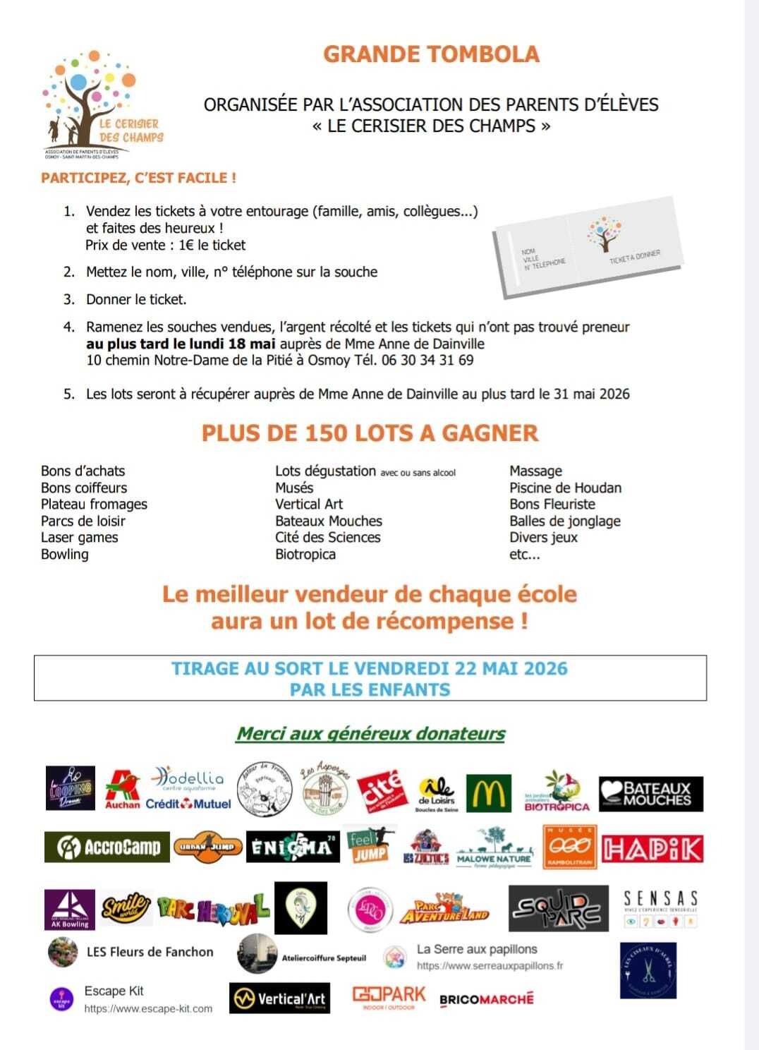 Lâassociation des parents dâĂ©lĂšves (APE du Cerisier des Champs) organise sa tombola !
